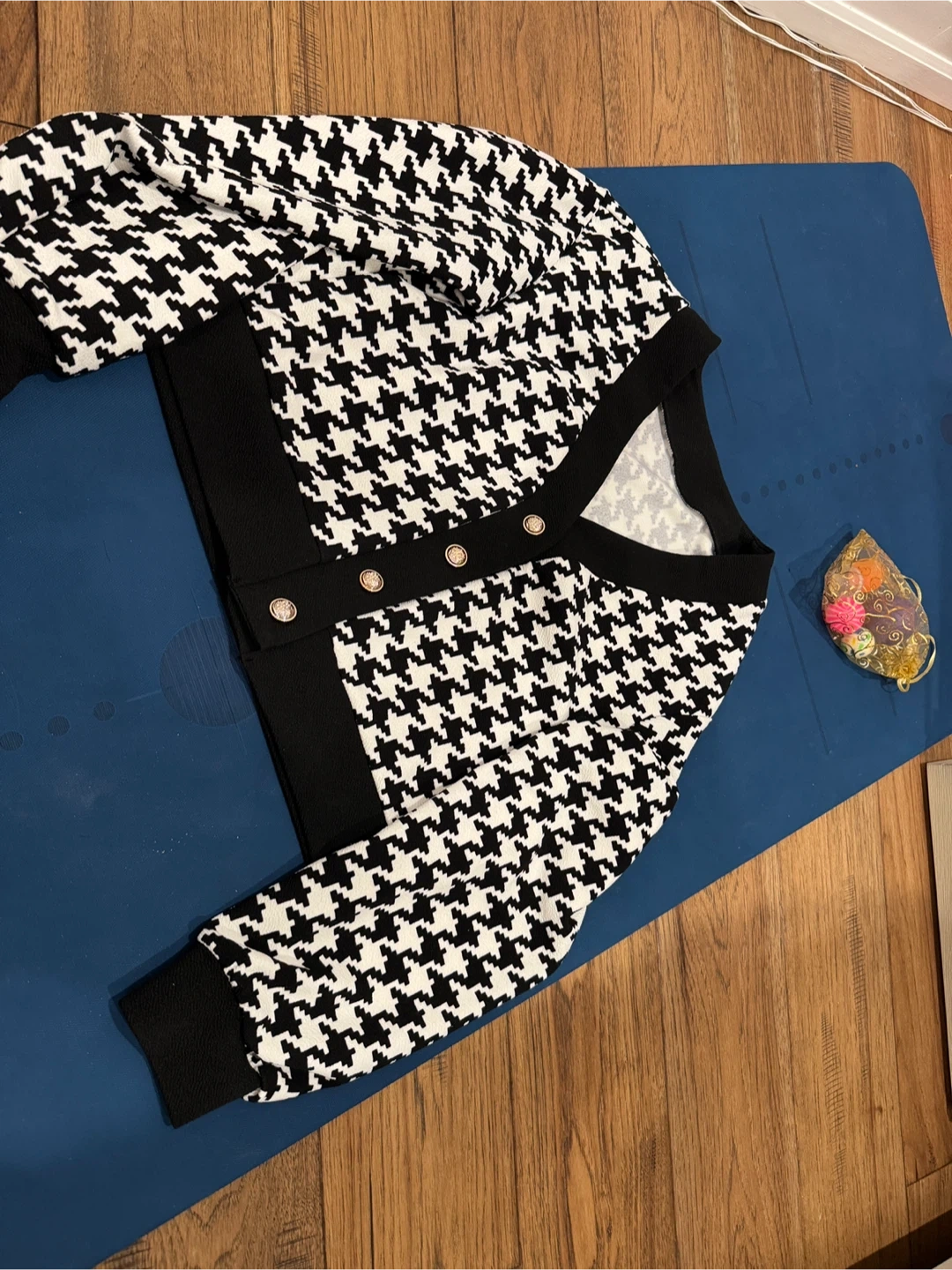 Black and white houndstooth pattern knit cardigan. It has a V-neck and button front closure. Material appears to be a knit blend.