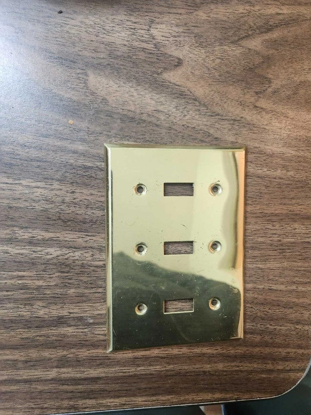Add a touch of retro charm to your home with this used triple switch plate cover! Featuring a shiny gold finish, this cover is in good condition, showing only slight wear and tear. It's the perfect piece to complete your vintage-inspired decor. If the ad is up, it's available!