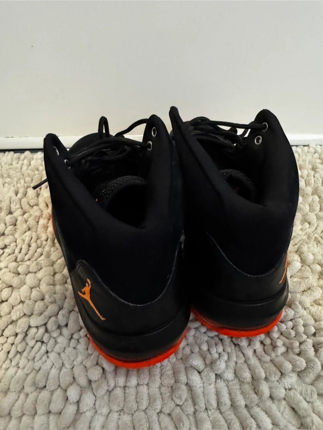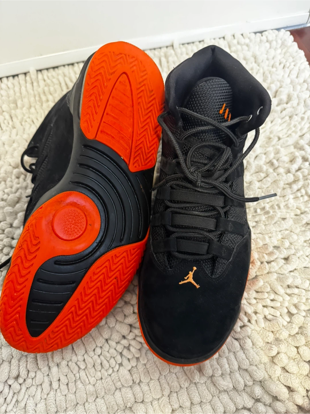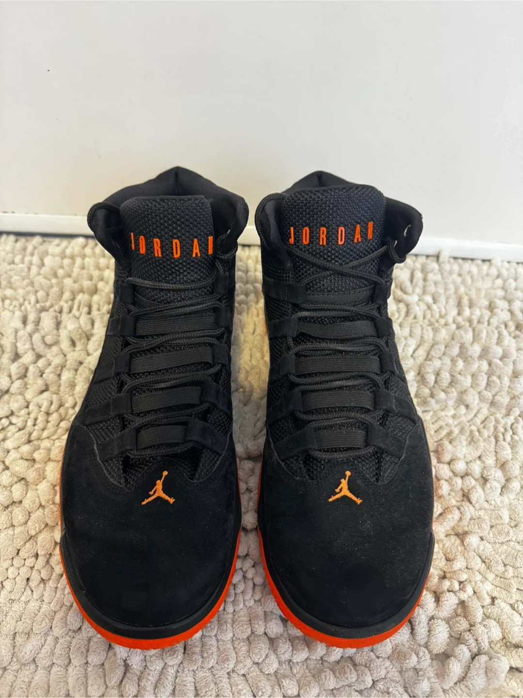 Jordan basketball shoes, designed in a sleek black and vibrant orange colourway, and marked as a size 11.