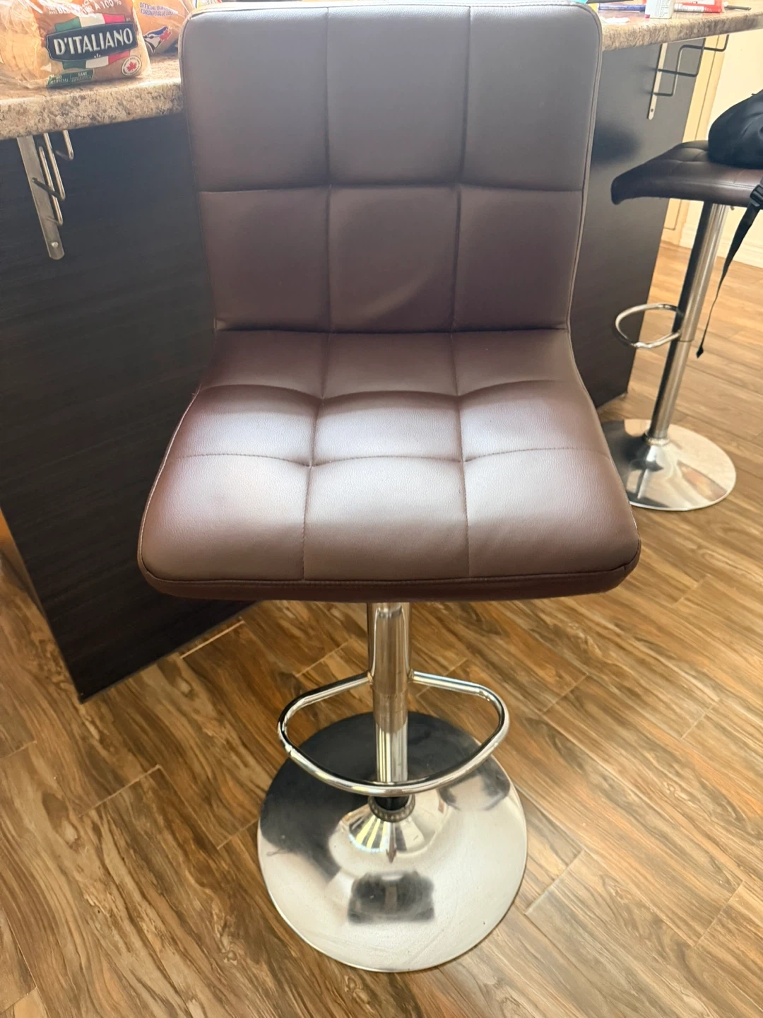 This bar stool features a comfortable padded seat upholstered in brown faux leather. It has a sturdy chrome base and a built-in footrest. The height is adjustable for convenience. Perfect for kitchen islands or home bars! One chair is $50