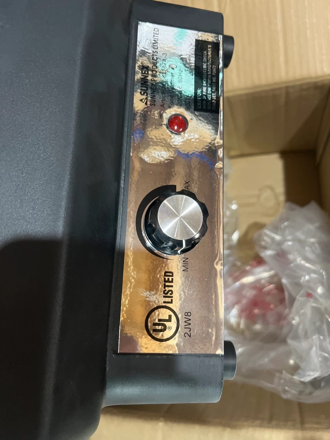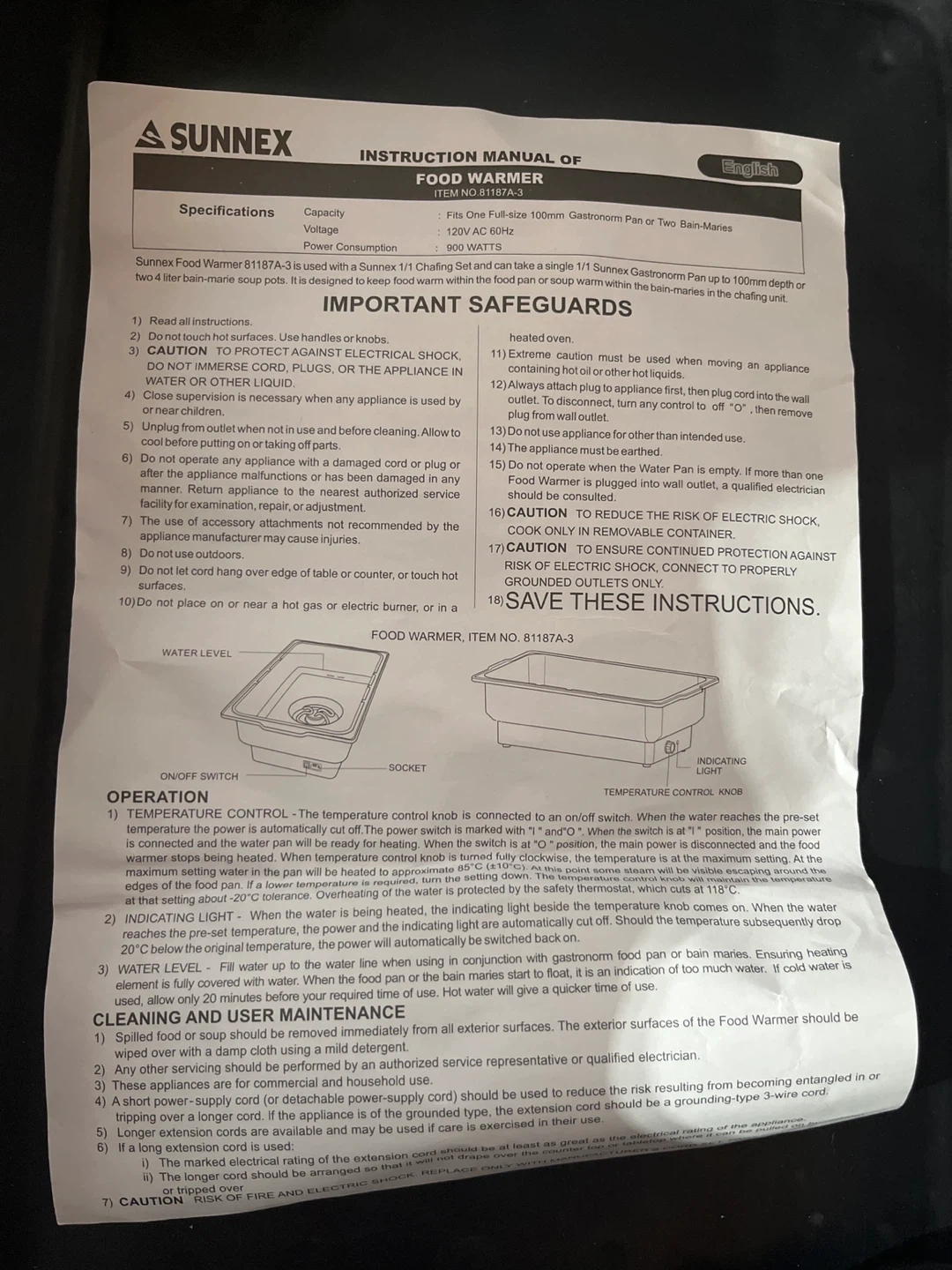 This Sunnex food warmer is designed for 100mm deep bain-marie pans. It has a 900 Watt power consumption and a temperature control knob for precise heating. Water level indicator is clearly visible.It’s plastic