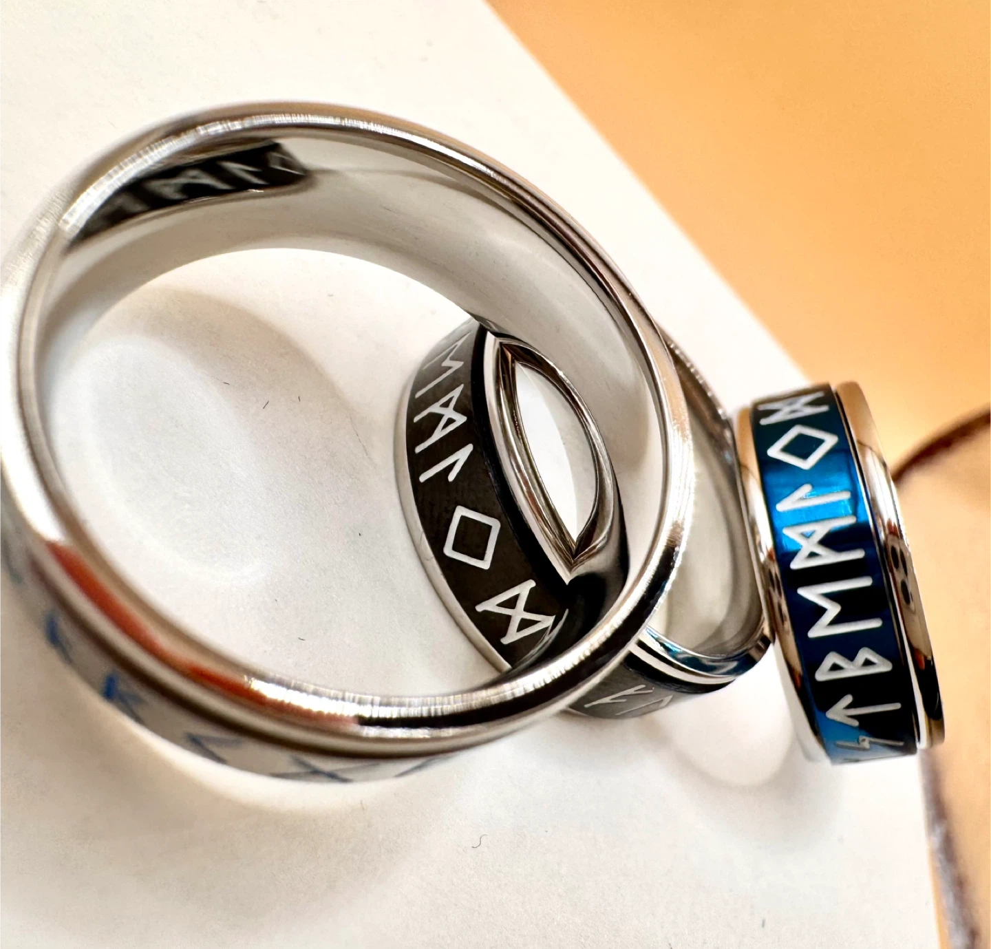 stainless steel spinner rings featuring Viking runes. One ring has a blue enamel inlay with runes, another has a black inlay with runes, and the third is plain silver with runes engraved. These rings have a smooth, polished finish.