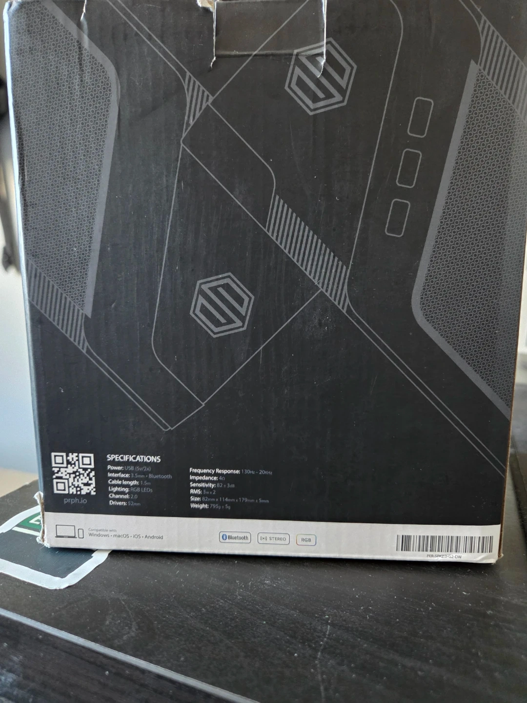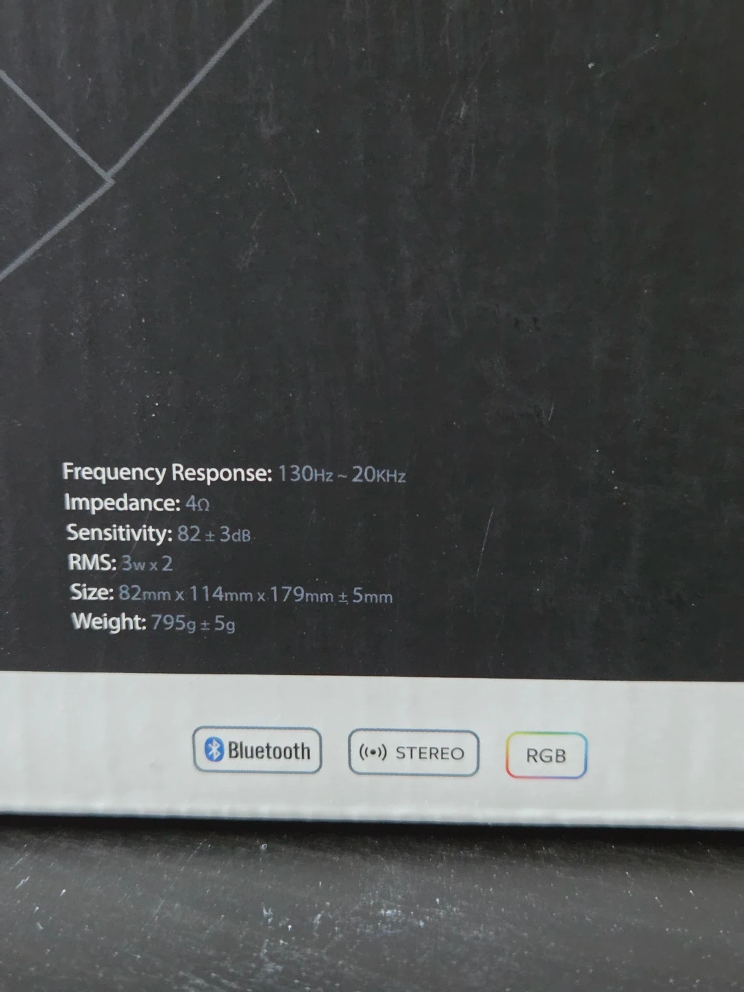 Pair of AUXiA Bluetooth speakers with RGB lighting. Features stereo sound and a frequency response of 130Hz-20KHz. Each speaker measures 82mm x 114mm x 179mm.