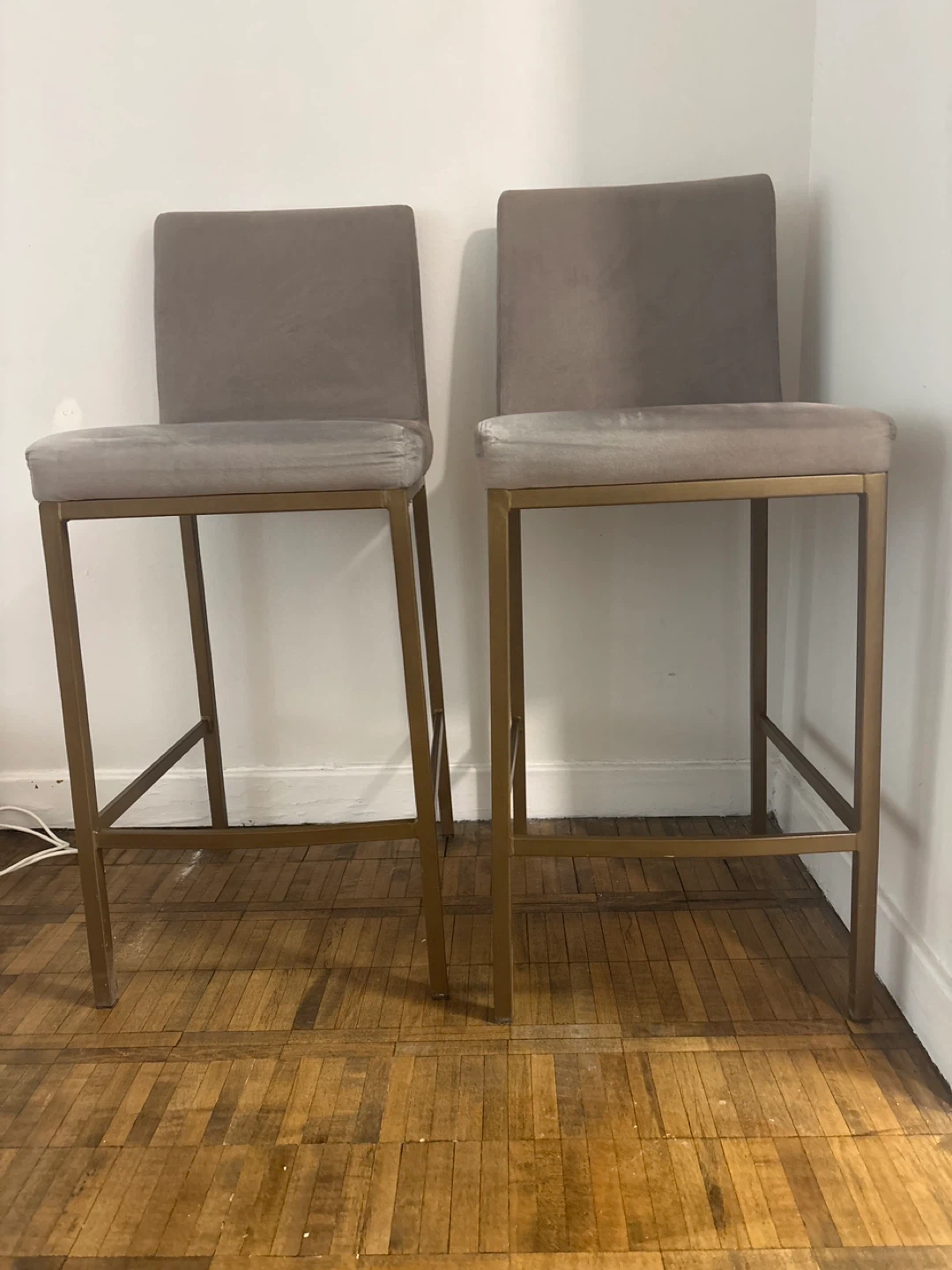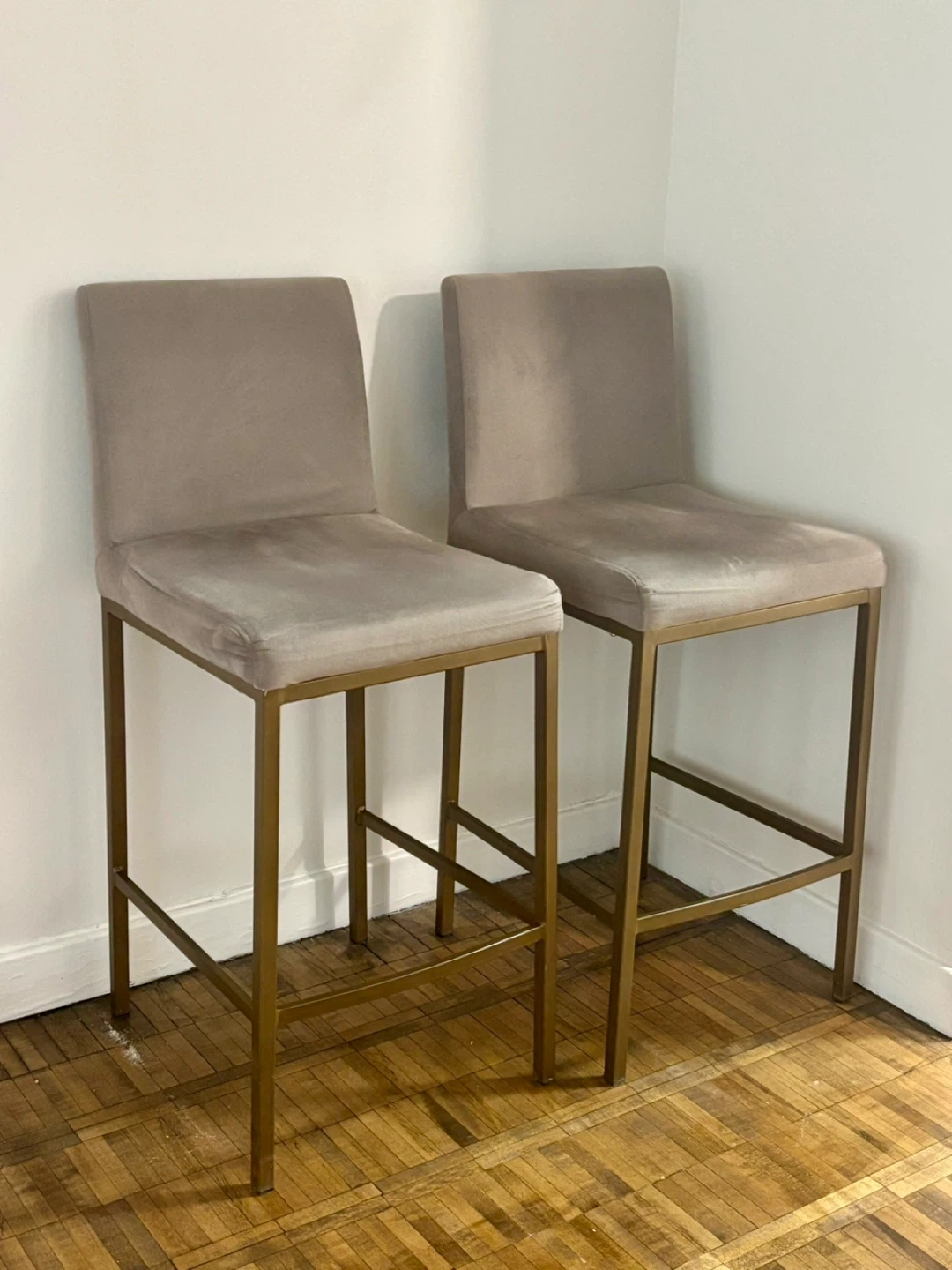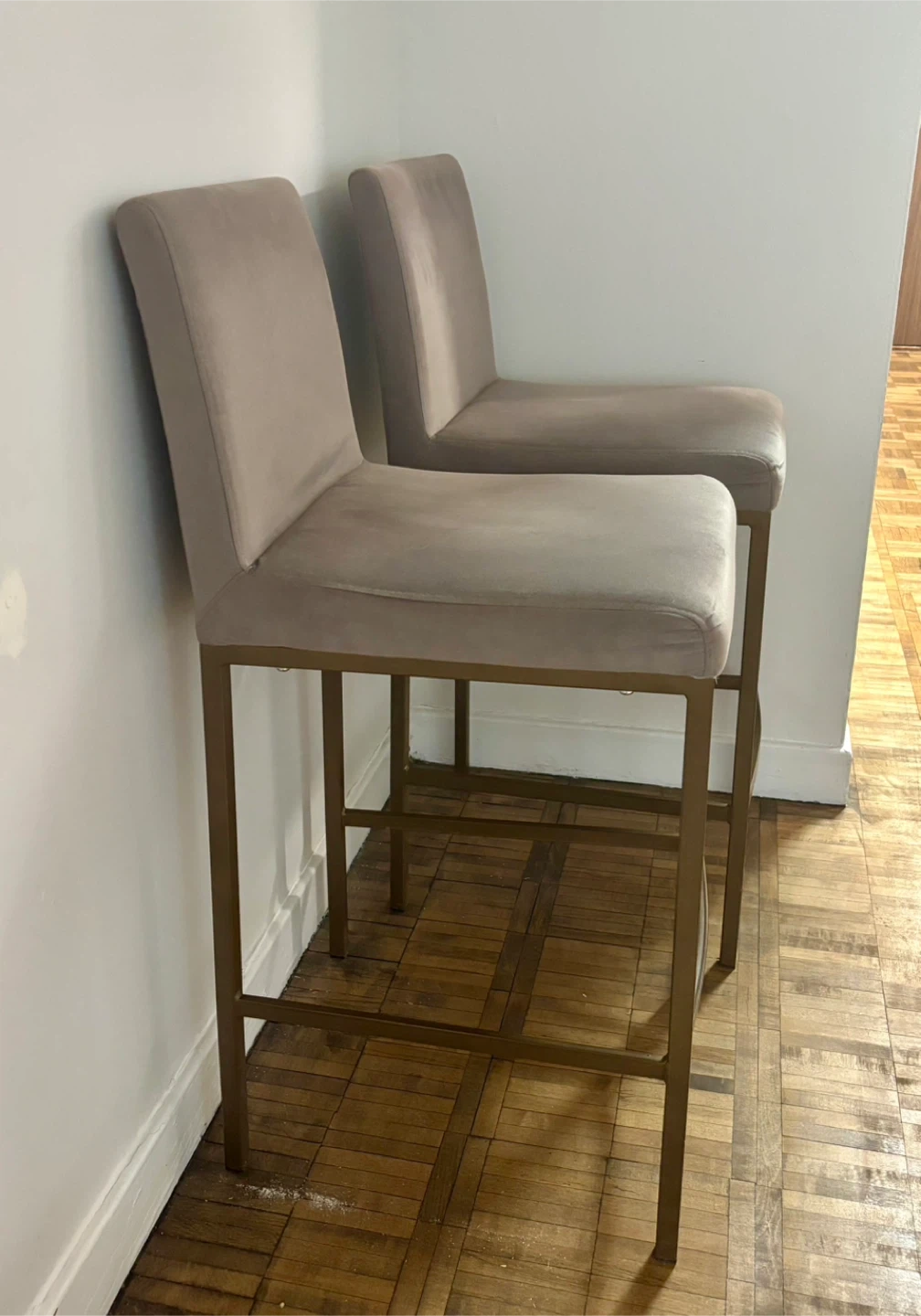 Two velvet bar stools with gold metal legs. These stools feature a comfortable upholstered seat and backrest. They're perfect for a kitchen island or home bar setup.