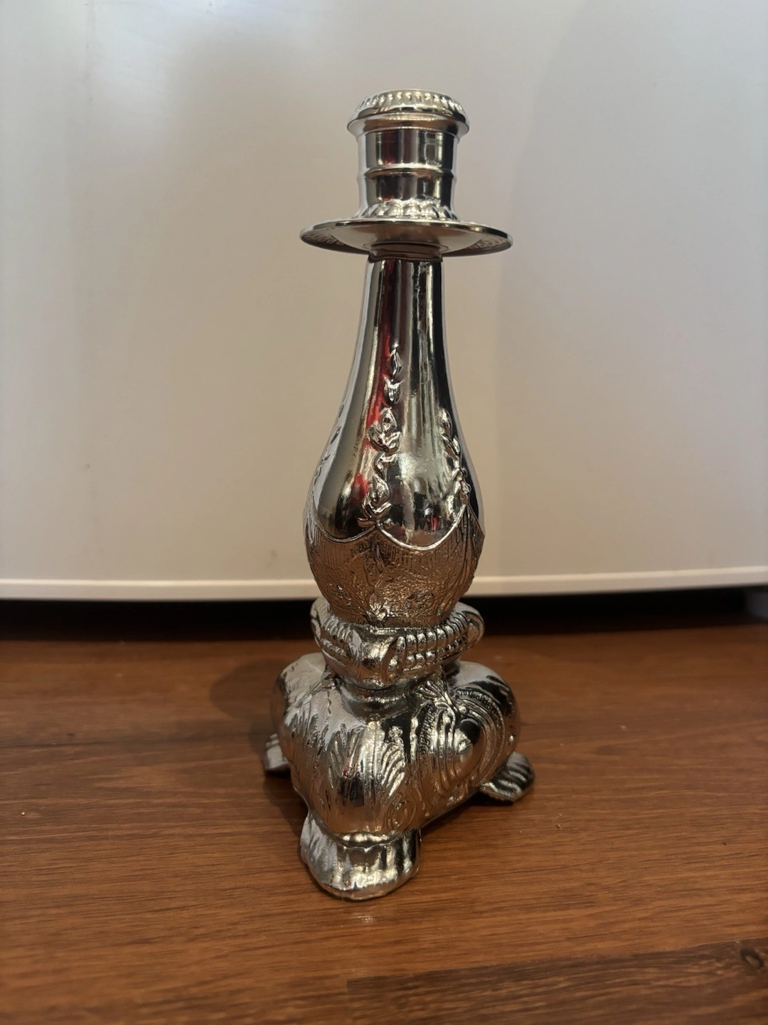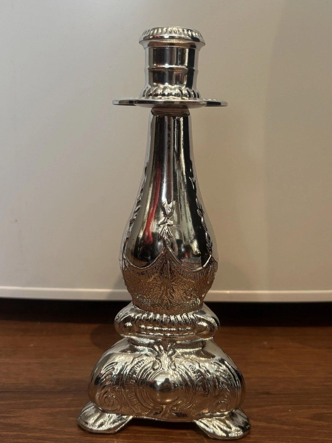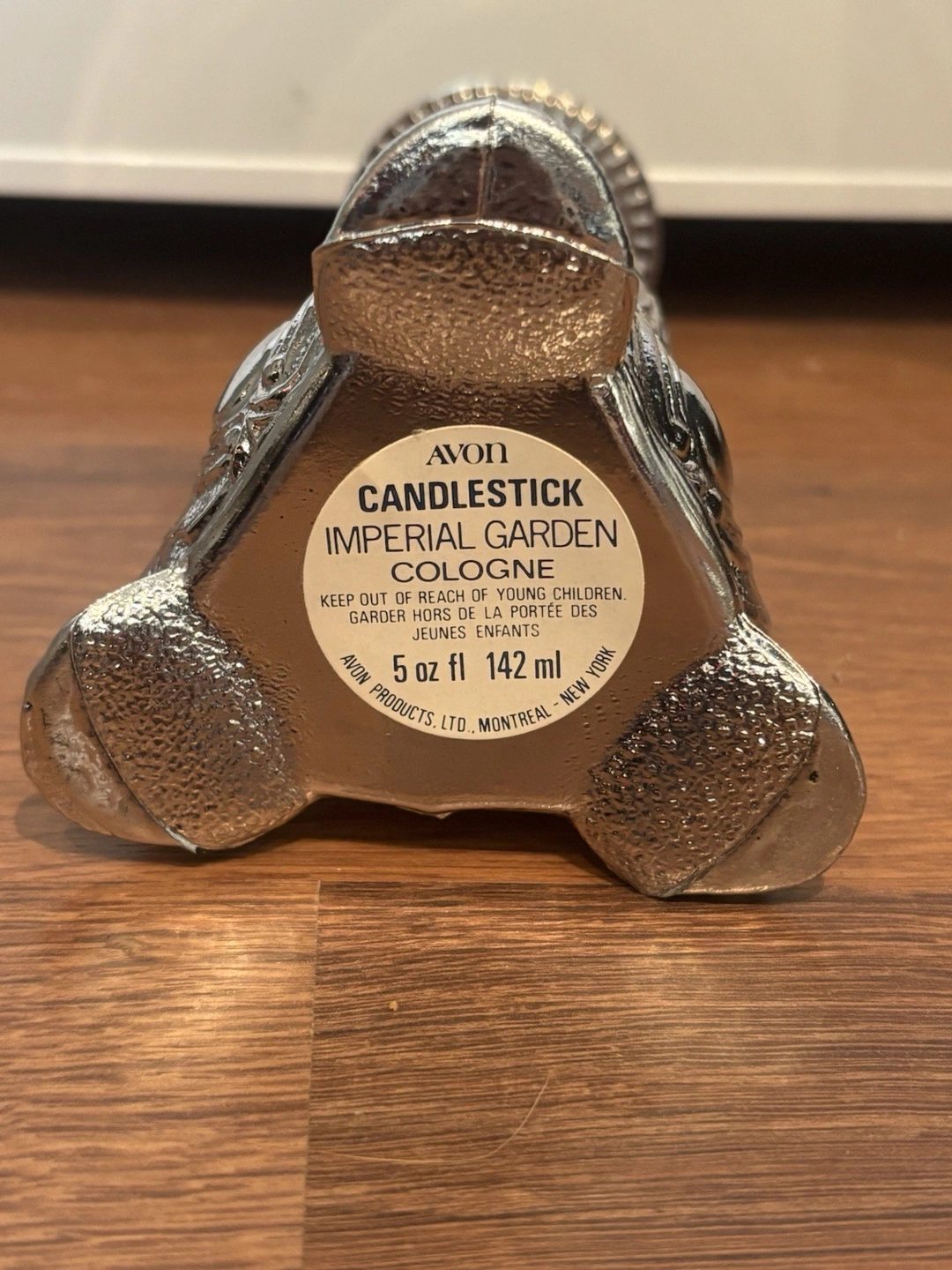 Decorative empty bottle. Shape: Candlestick, Color: Silver, Material: Glass, Brand: Avon, Type: Bottle, Era: Late 20th Century (1970-1999), Item Height: 8 in, Style: 1970s, Original/Reproduction: Original, Time Period Manufactured: 1972-1975, Finish: Painted, Item Width: 3.5 in, Handmade: No, Country of Origin: United States.