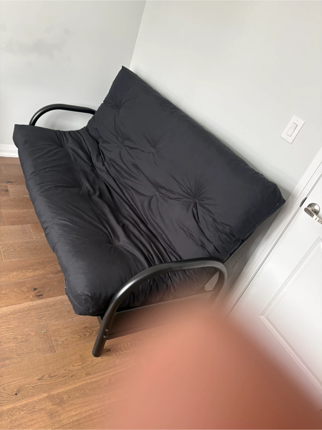 This is a black futon sofa bed. It's made with a metal frame and a tufted mattress. It easily converts from a sofa to a bed. This futon is great for small spaces or guest rooms! I bought this 3 months ago for $530 , now I got to move can’t bring it with me. Come and pickup asap. Make a fair offer