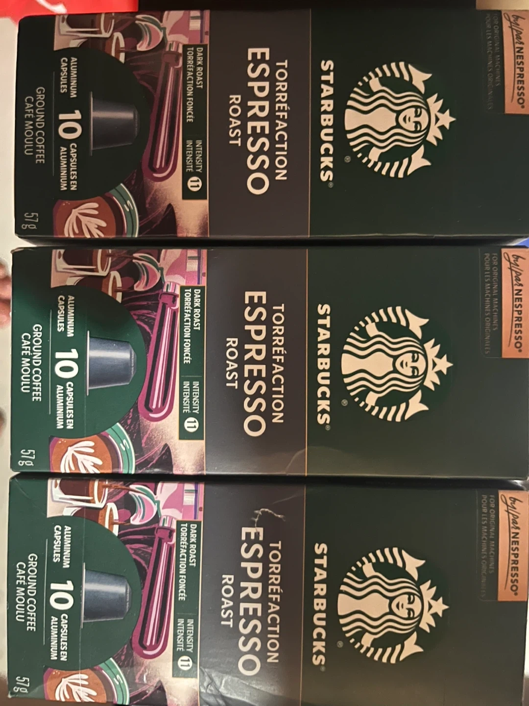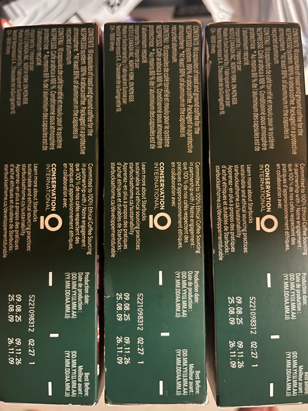 Three boxes of Starbucks Nespresso compatible coffee capsules. Each box contains 10 aluminum capsules of Espresso Roast, a dark roast flavour. These capsules are for original machines. Production date: 09.08.25. (3packs $6 each)