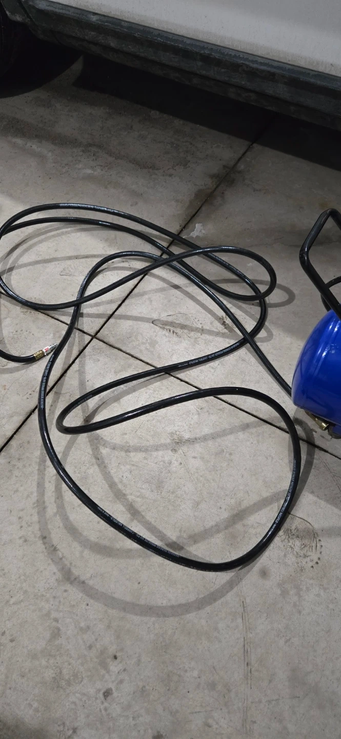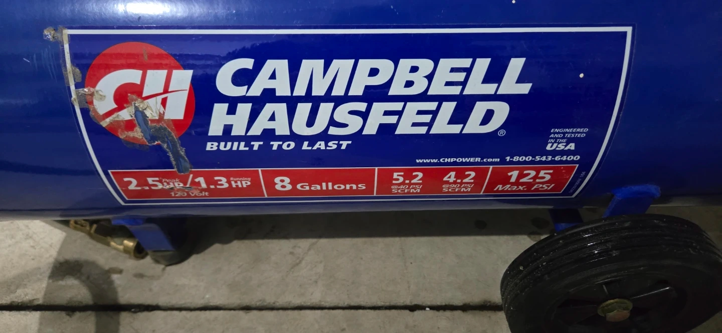 Campbell Hausfeld air compressor with an 8-gallon tank. It runs on 120 Volt and has a maximum PSI of 125. Air hose included.