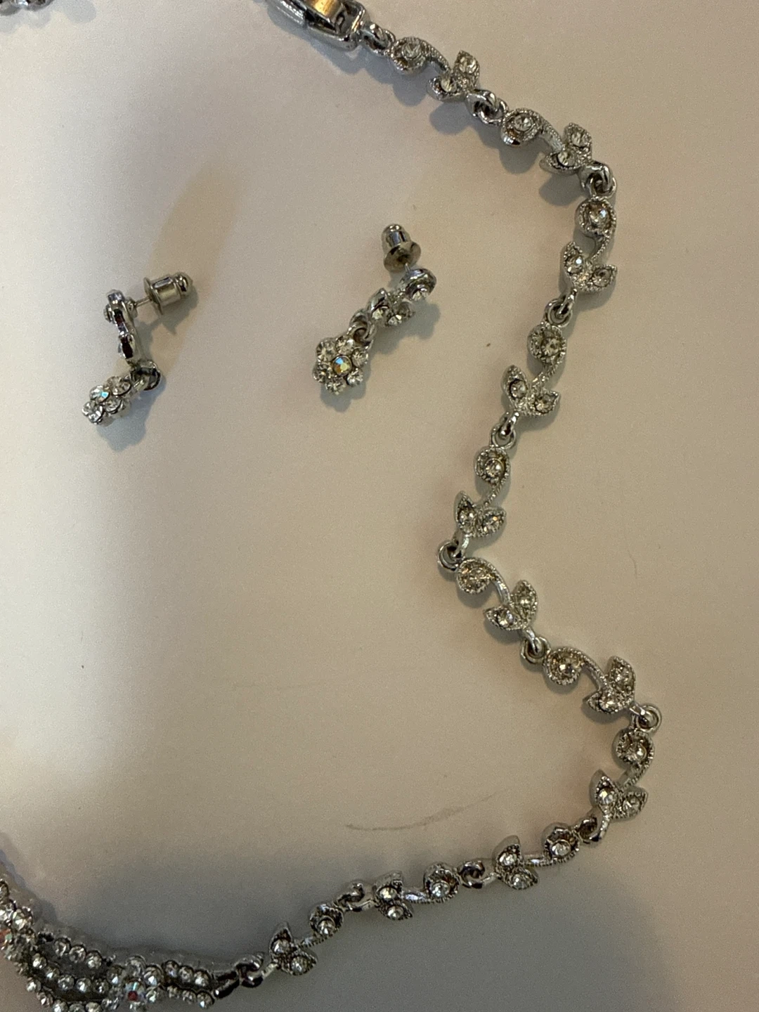 Sparkly silver-tone necklace and matching earrings adorned with rhinestones. This set features a delicate leaf and vine design.
