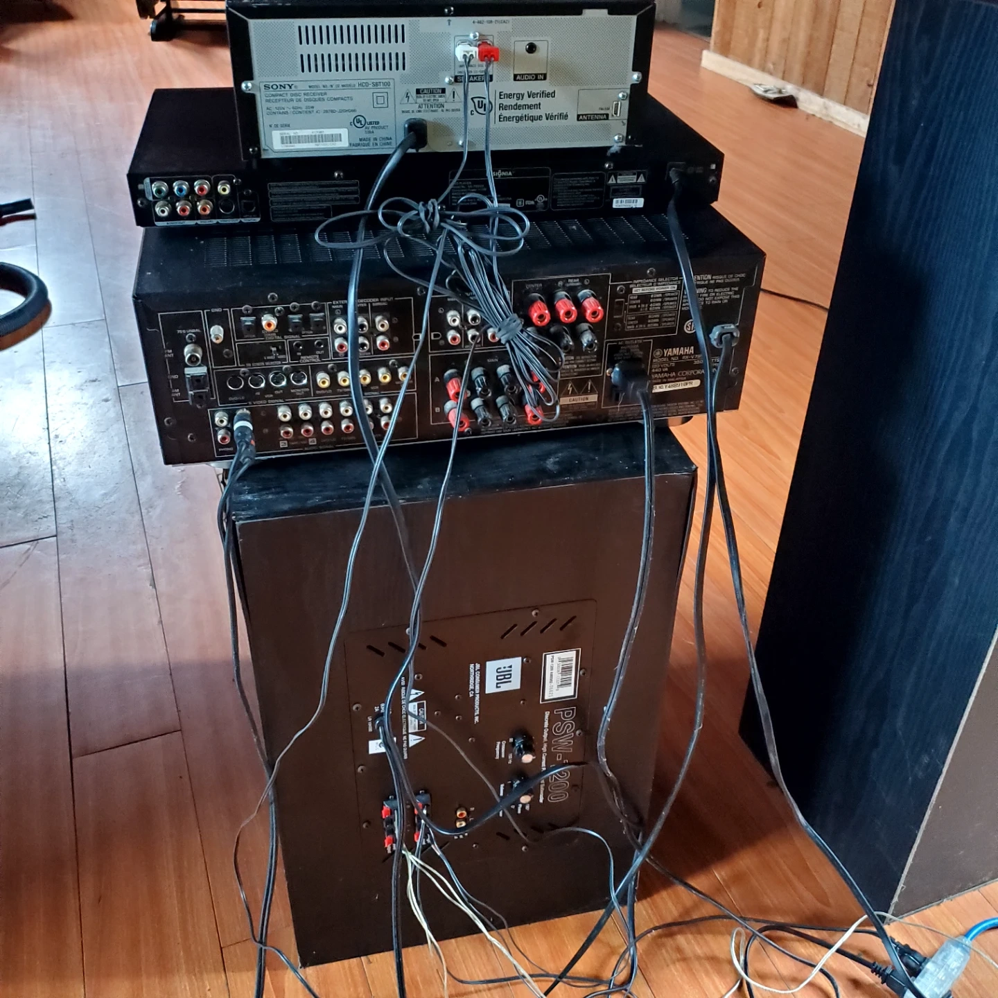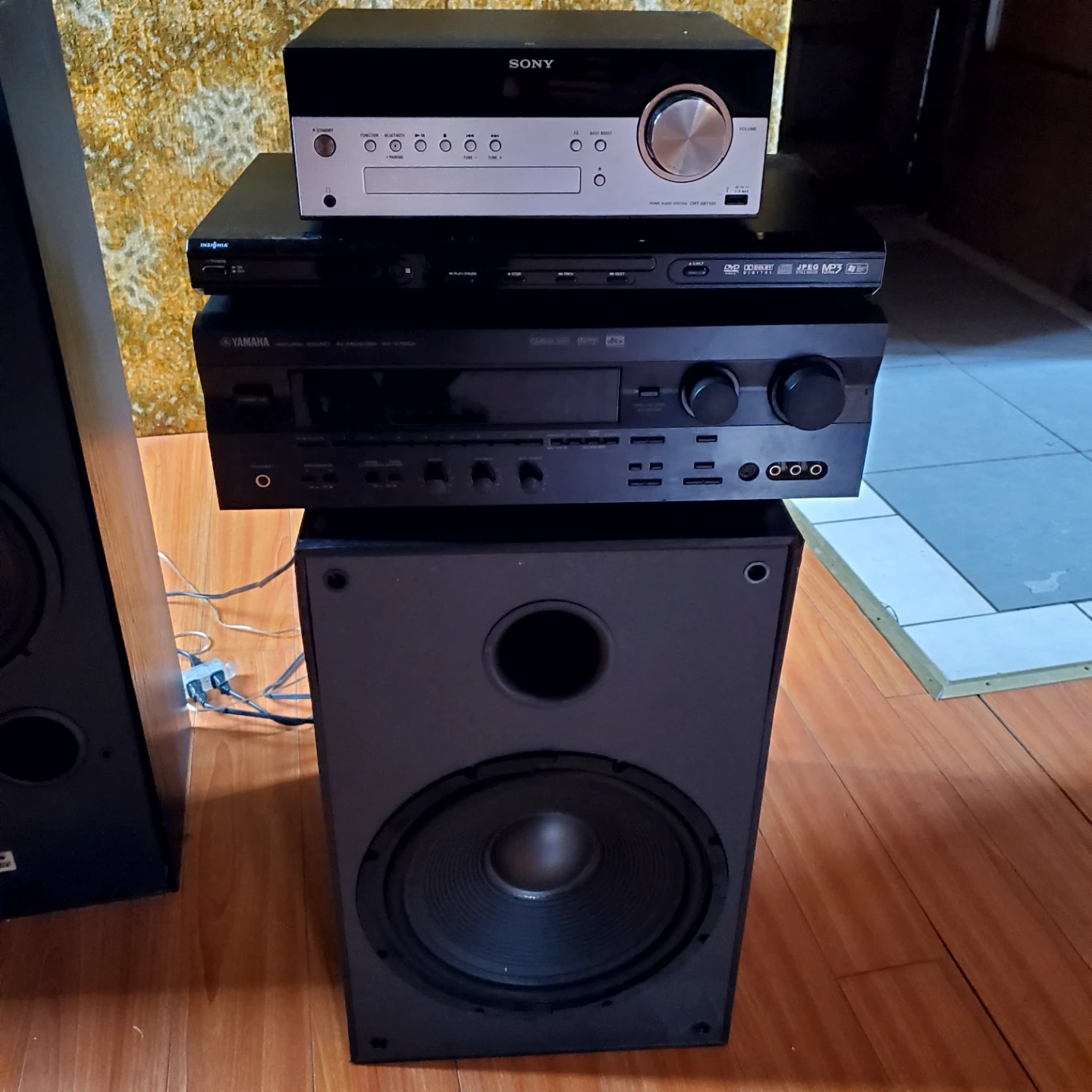 Yamaha natural sound AV receiver RX-V765 and a Sony CD player with a JBL PSM-120 subwoofer plus a DVD player. The receiver supports Dolby Digital and DTS. The subwoofer features a 12" woofer and adjustable frequency response. Also included are Vivid Reference 3-way tower speakers with 10" woofers plus two small speakers for surround sound style.