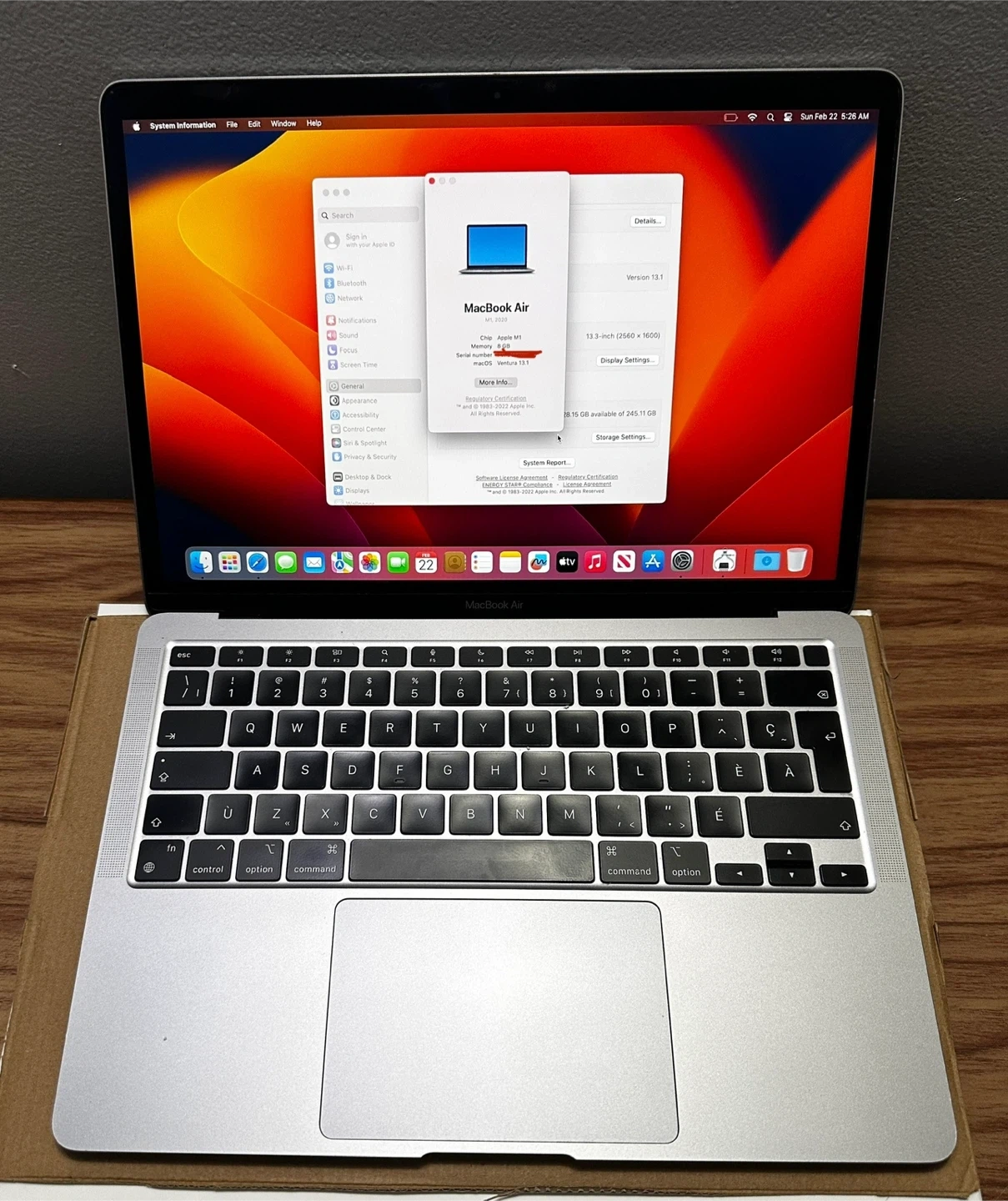 Selling a silver Apple MacBook Air with M1 chip(8-core) It features a 13.3-inch Retina display and 256GB of storage. And 8 GB RAM comes with charger and cable. In fair condition.