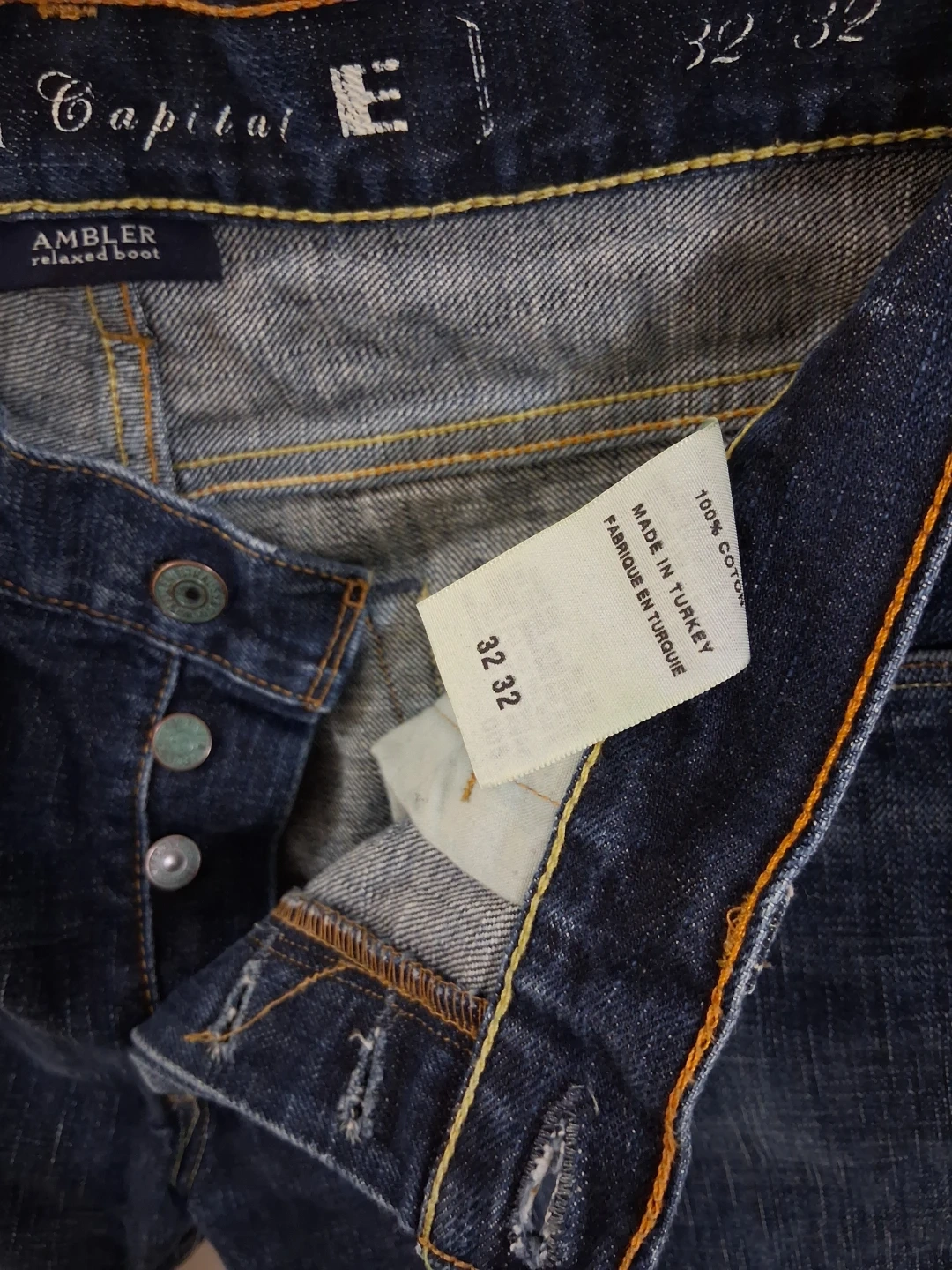 Levi's Capital E Ambler relaxed boot jeans in size 32. These jeans are made of 100% cotton and were made in Turkey. They are a dark wash denim and in good condition!