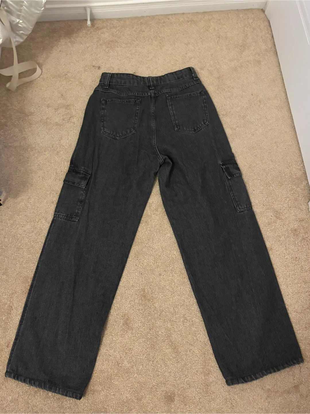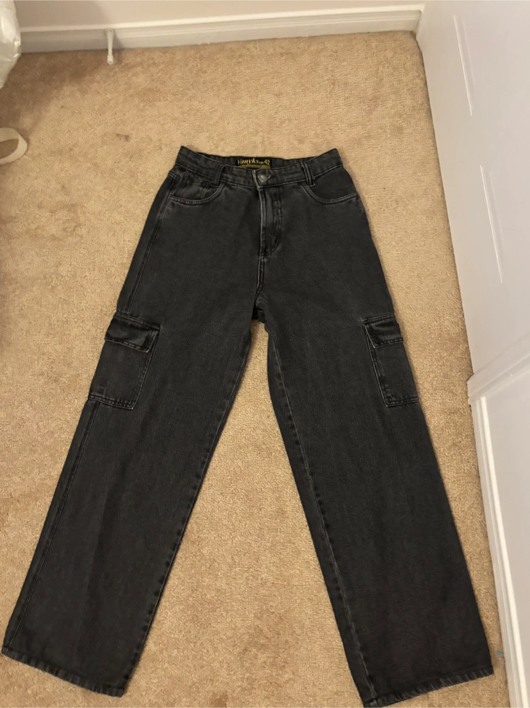 I'm selling a pair of black cargo jeans. They are in great condition and ready for a new wardrobe. These are perfect for a casual look!
