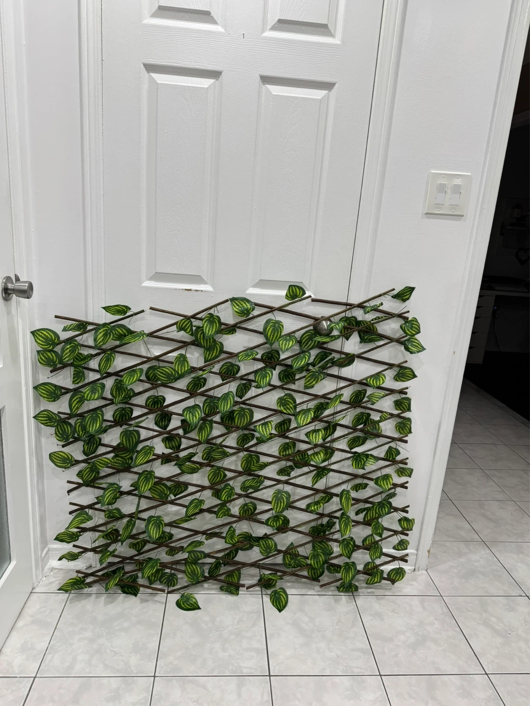 This expandable garden trellis is covered in realistic artificial ivy leaves. It's great for adding privacy or decoration to fences, walls, or balconies. The wooden lattice expands to your desired width and is easy to install.