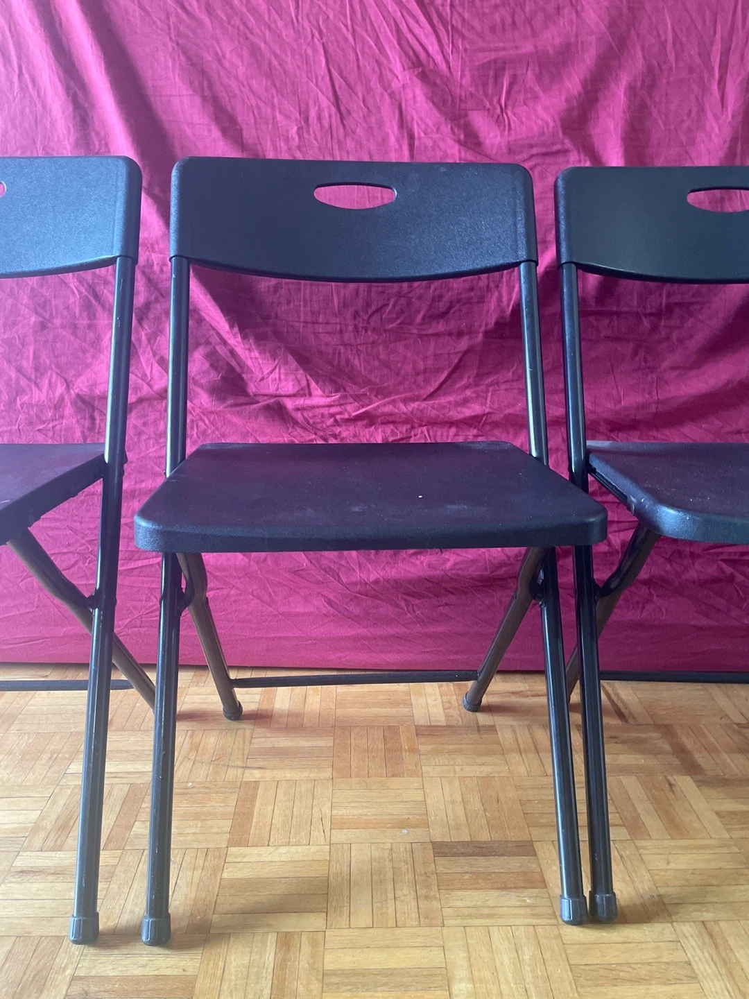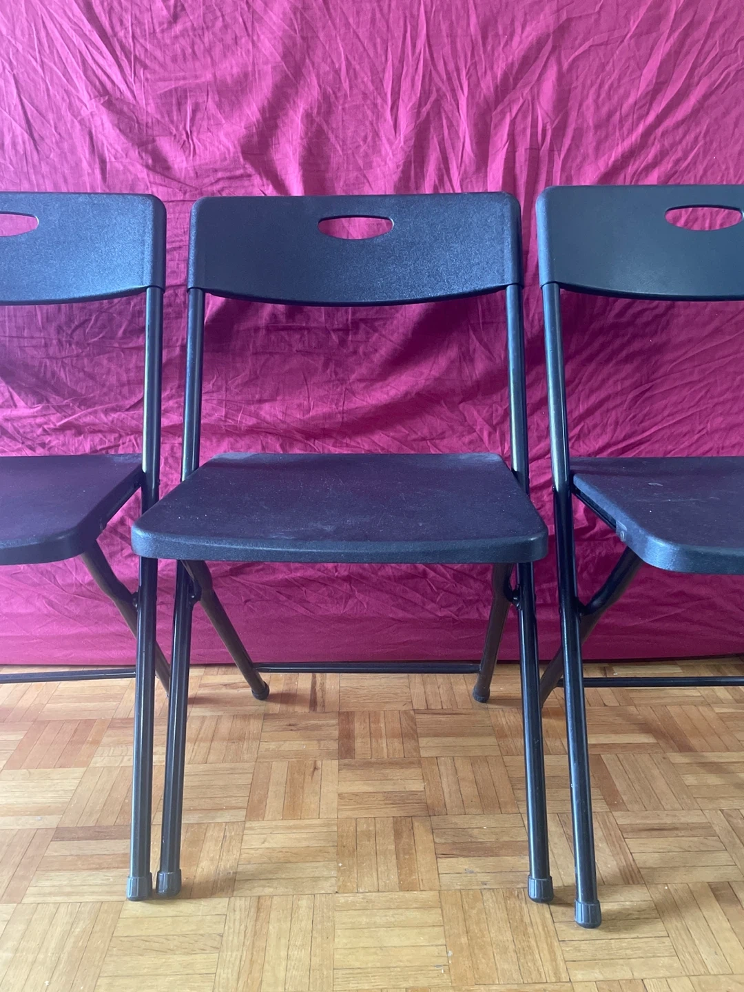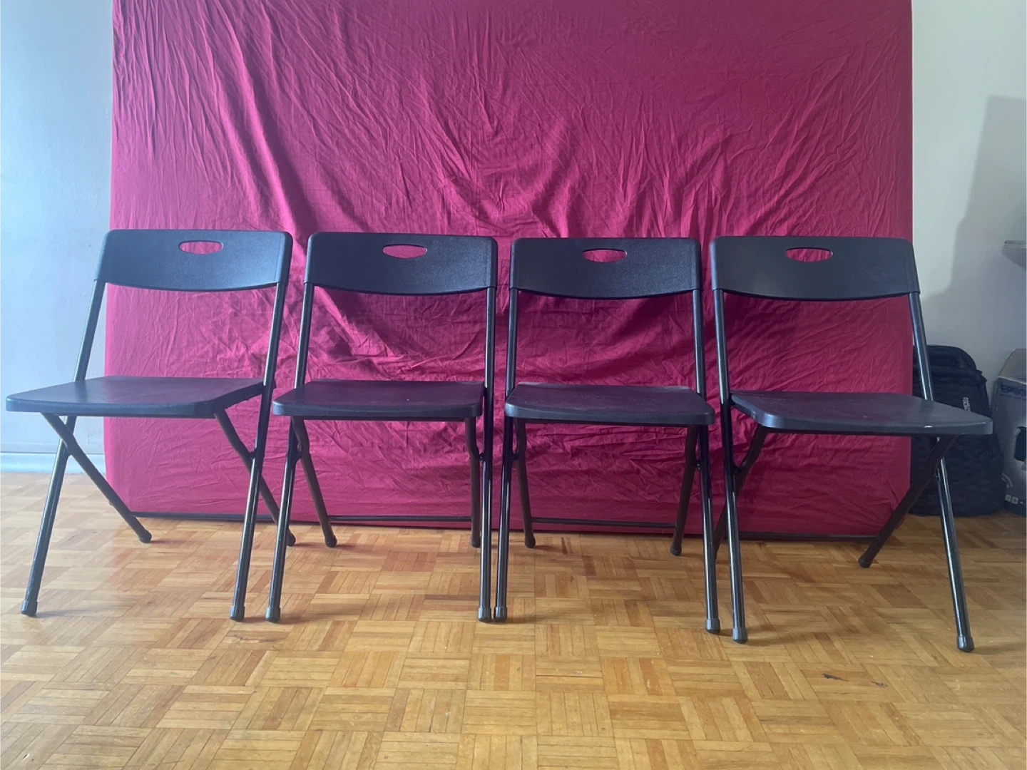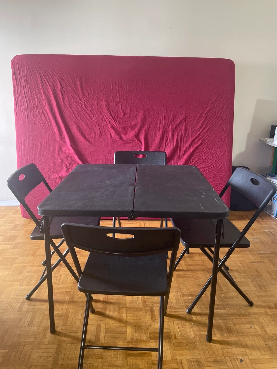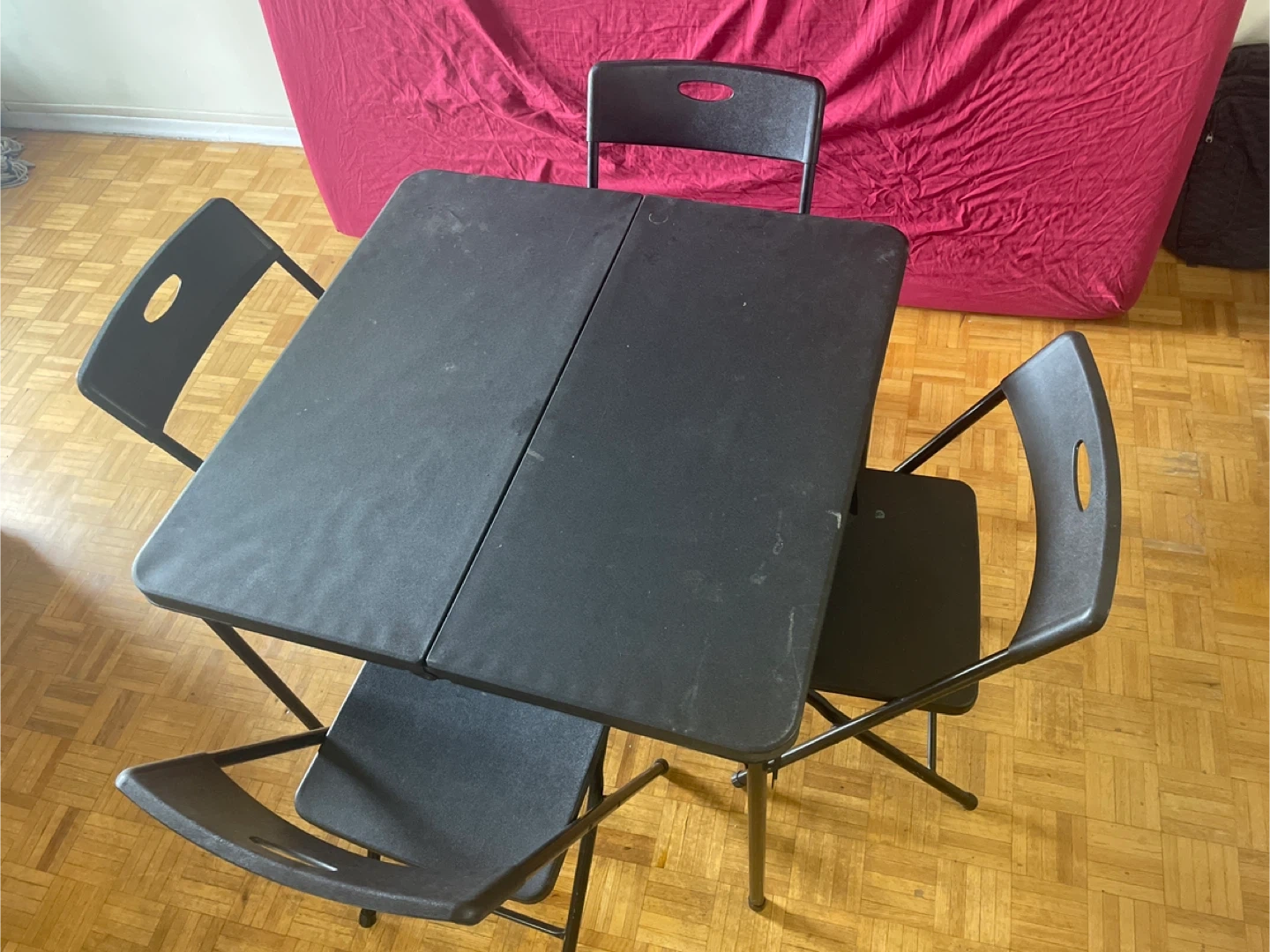 Selling a black plastic folding dining set with 1 table and 4 chairs.