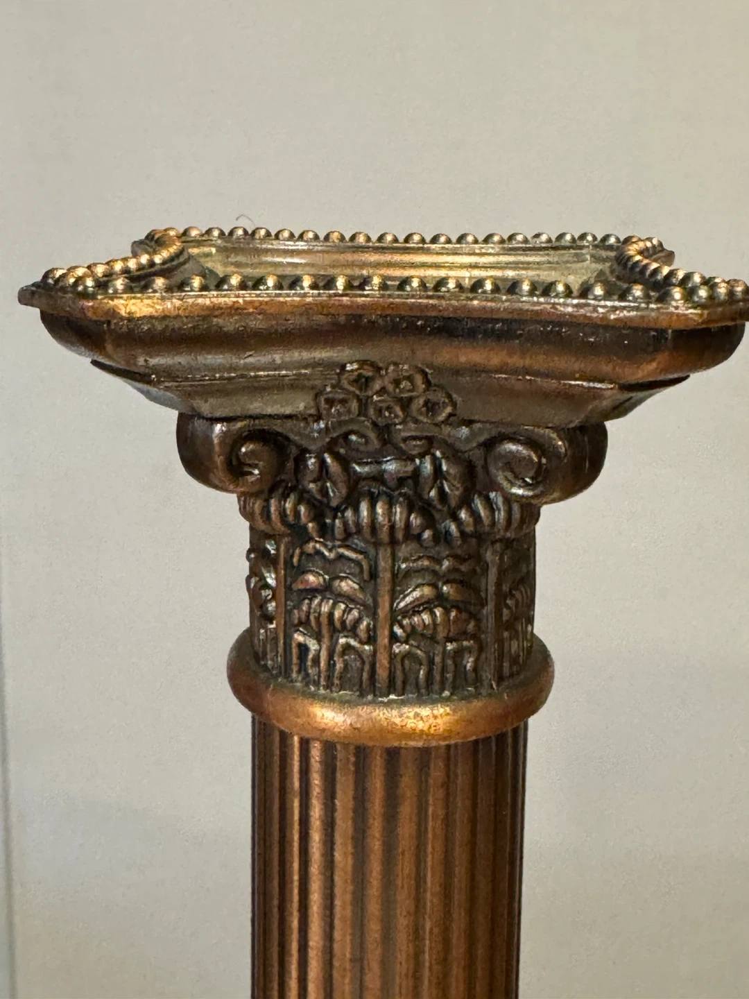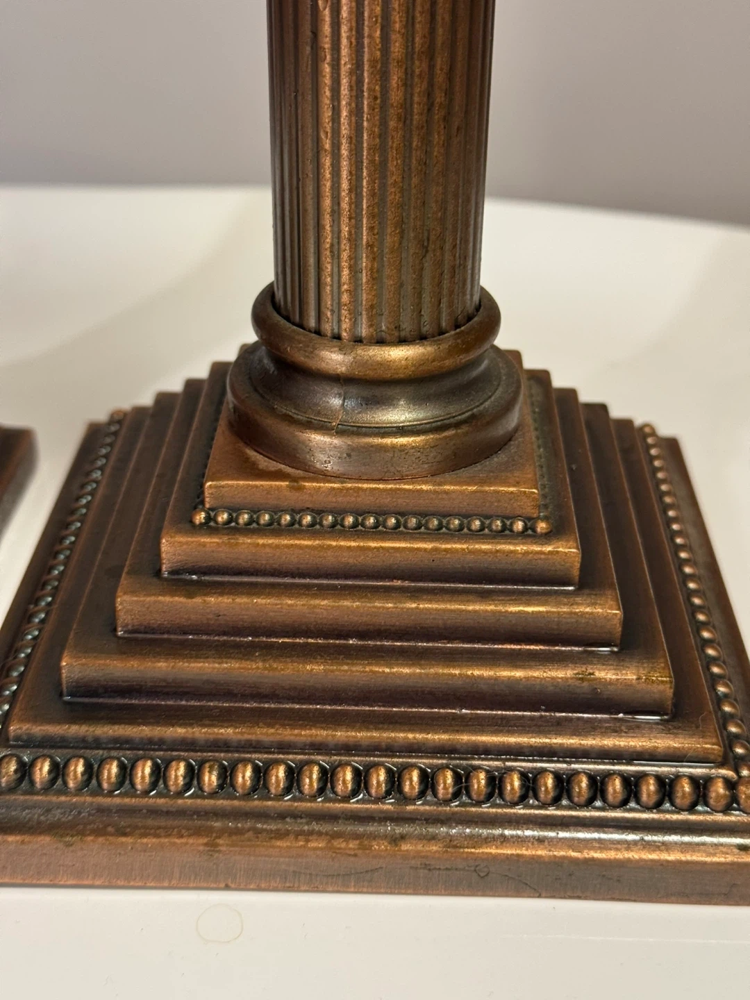 This listing is for a pair of decorative candlestick holders with a column design. They have an ornate top and base with a fluted body. These would make a great accent piece for a mantel or table.