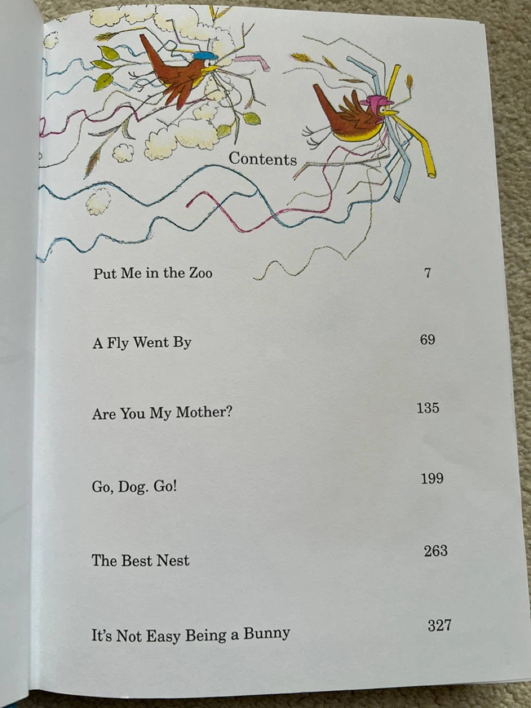 This book contains six classic beginner reader stories: Put Me in the Zoo, A Fly Went By, Are You My Mother?, Go, Dog. Go!, The Best Nest, and It's Not Easy Being a Bunny. Great for beginner readers.