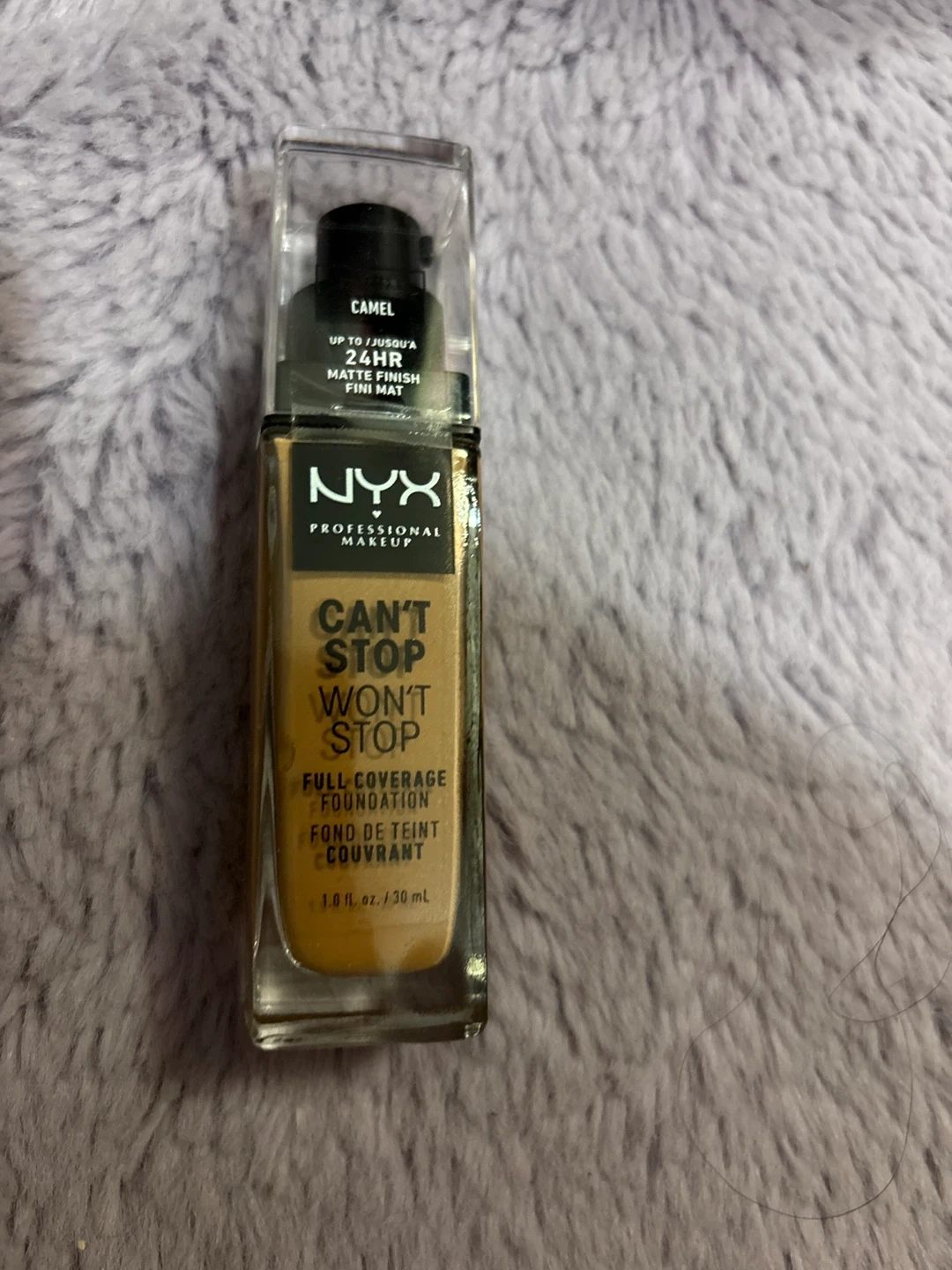 NYX Can't Stop Won't Stop Full Coverage Foundation in shade Camel. It offers a matte finish with up to 24-hour wear. This foundation is 1.0 fl. oz. / 30 ml. Great for those seeking a long-lasting, full-coverage base!