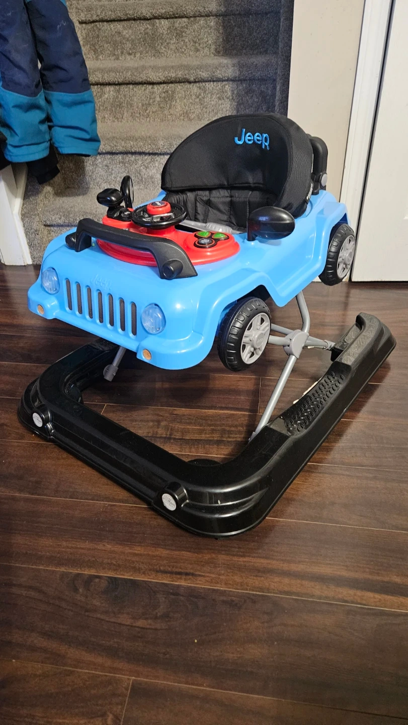 This blue Jeep-themed baby walker is ready for your little explorer! It features a steering wheel and fun dashboard details for interactive play. Its sturdy design helps support your baby as they learn to walk.