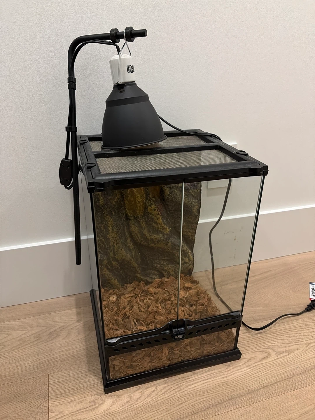 Glass terrarium with a decorative rock background and substrate. Includes a clamp-on heat lamp with adjustable arm. The front doors open for easy access. This setup is suitable for small reptiles or amphibians.