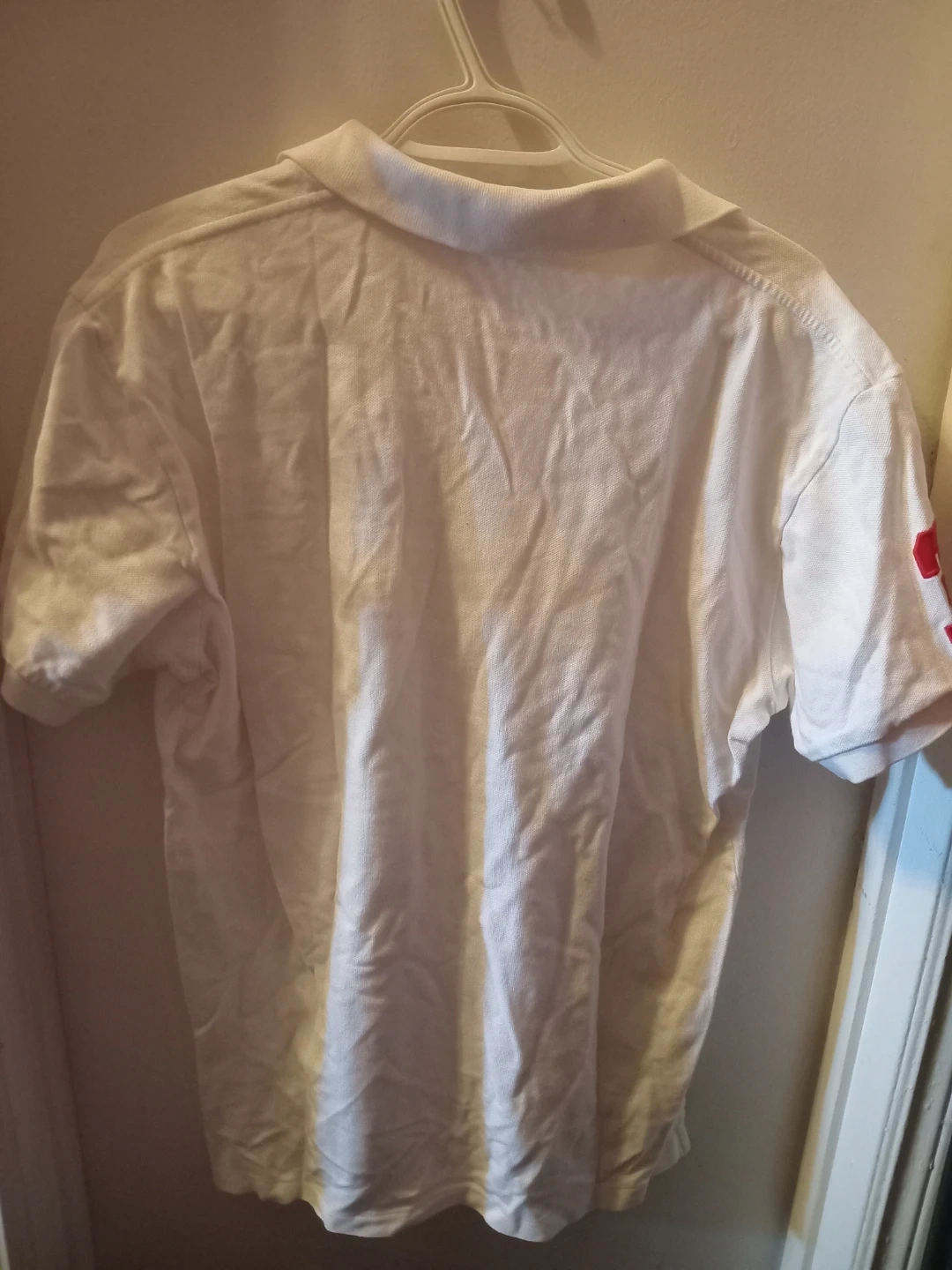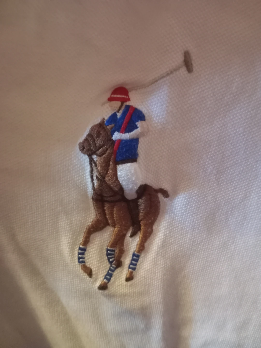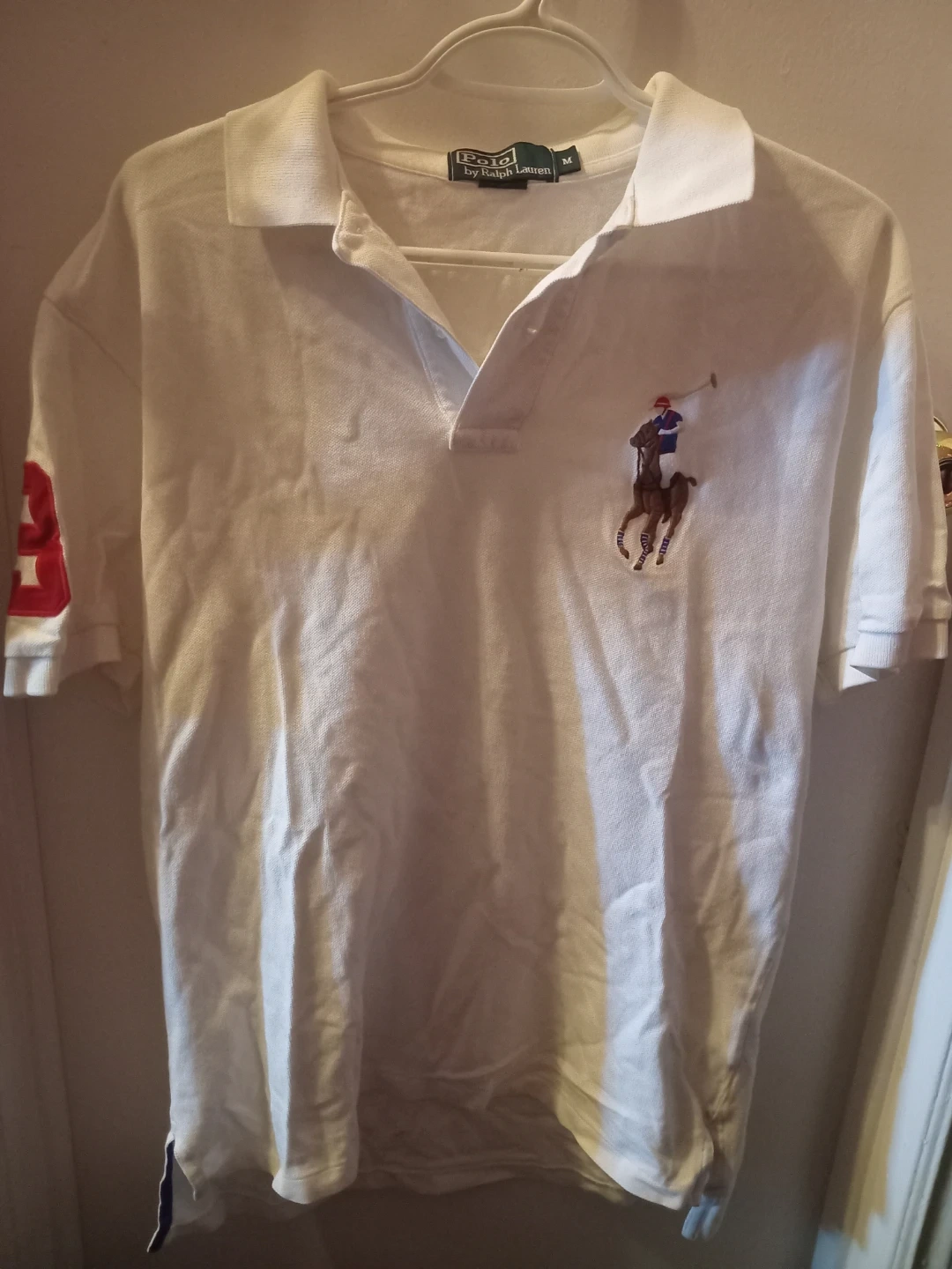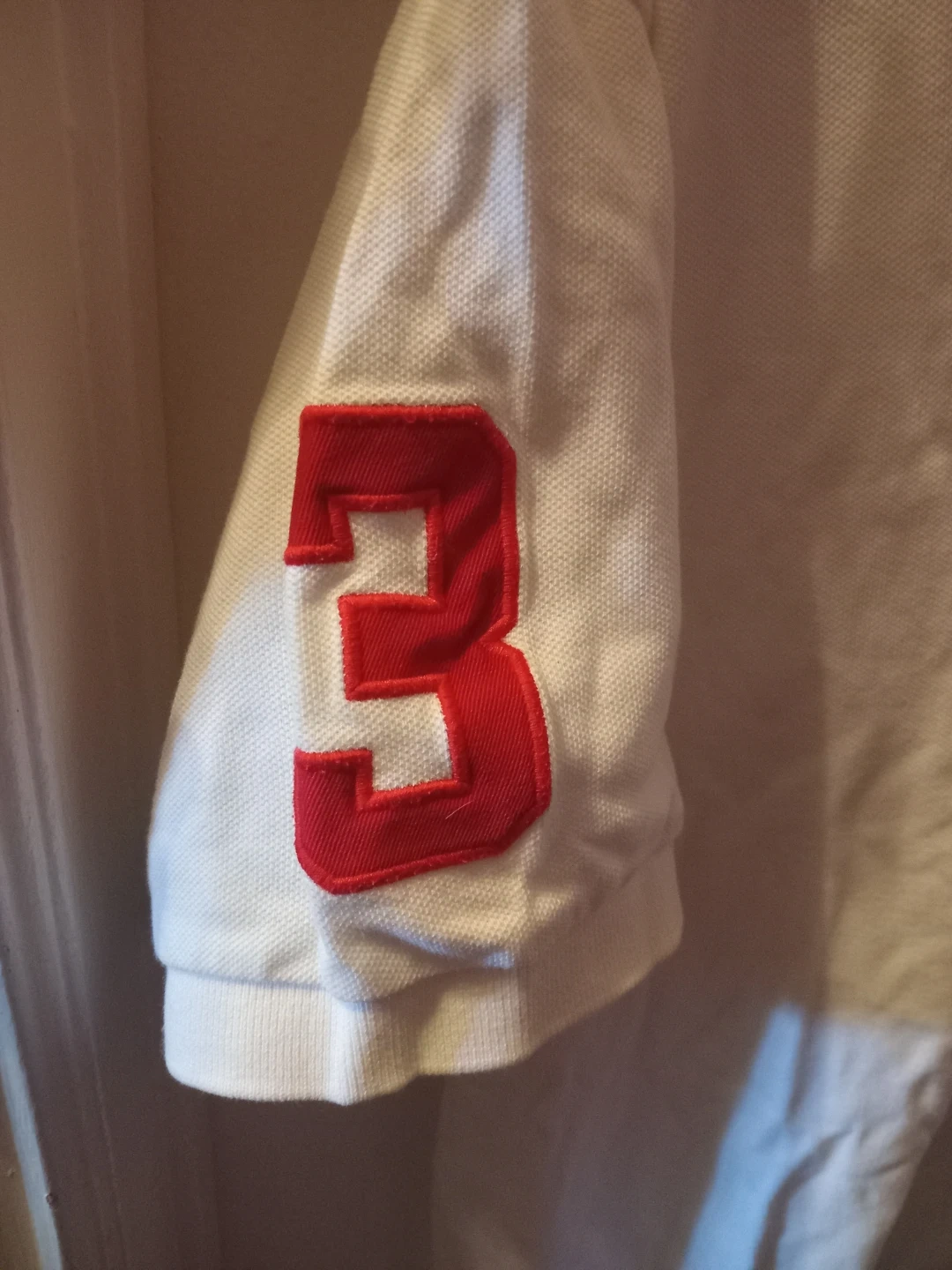 White Polo by Ralph Lauren short sleeve polo shirt. Features the classic polo player embroidery on the chest and a red number 3 on the sleeve. It's size medium.