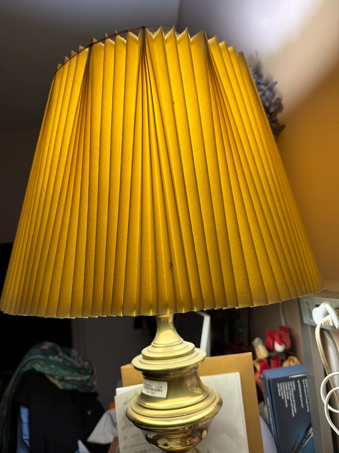 This is a vintage-style table lamp featuring a pleated yellow fabric lampshade. The base is made of brass with a decorative, stacked design. It provides a warm and inviting glow when lit.