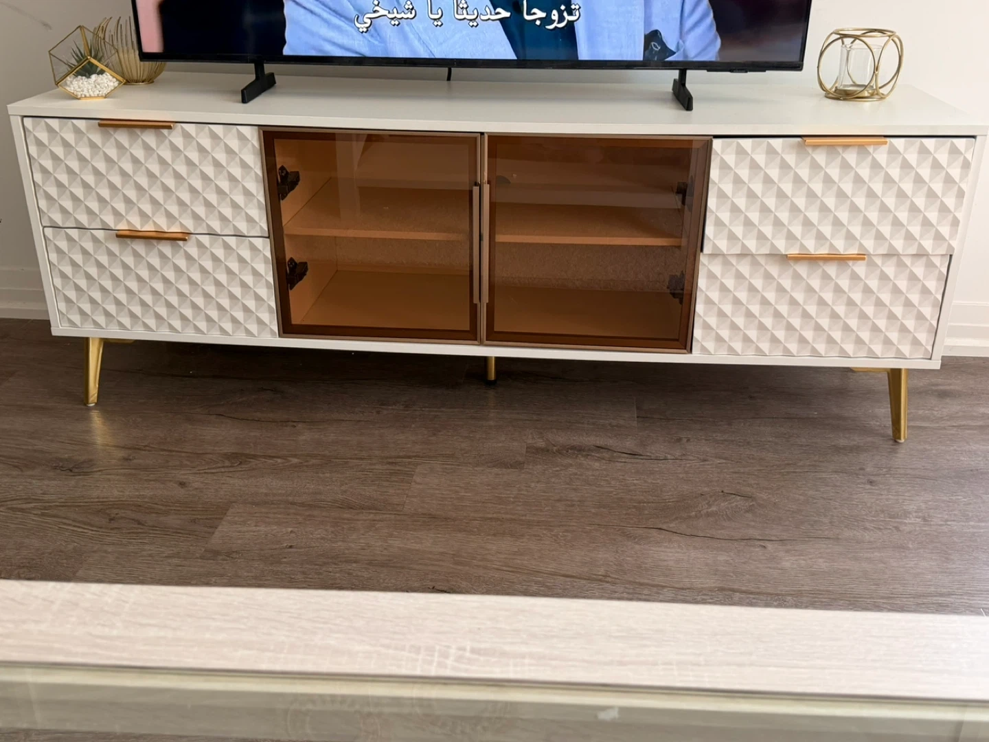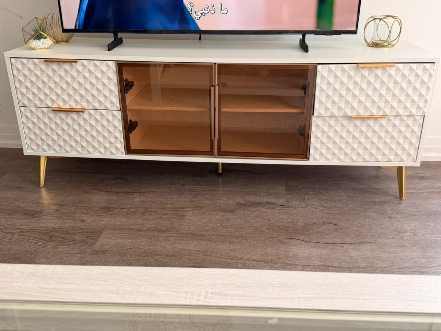 Modern white media console featuring a diamond-patterned design on the drawers. It has two glass-fronted cabinets with shelving inside, perfect for storing electronics or decor. The unit rests on stylish gold-toned legs.