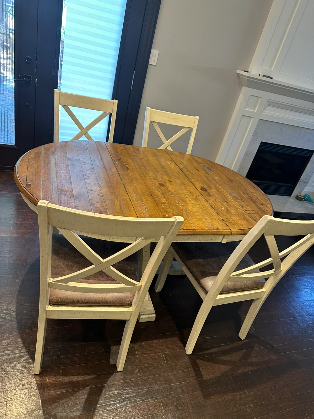 This set features a rustic wooden dining table with four chairs. The table has a natural wood finish, and the chairs are painted a distressed cream colour with upholstered seats. It's a great set for casual family dinners!