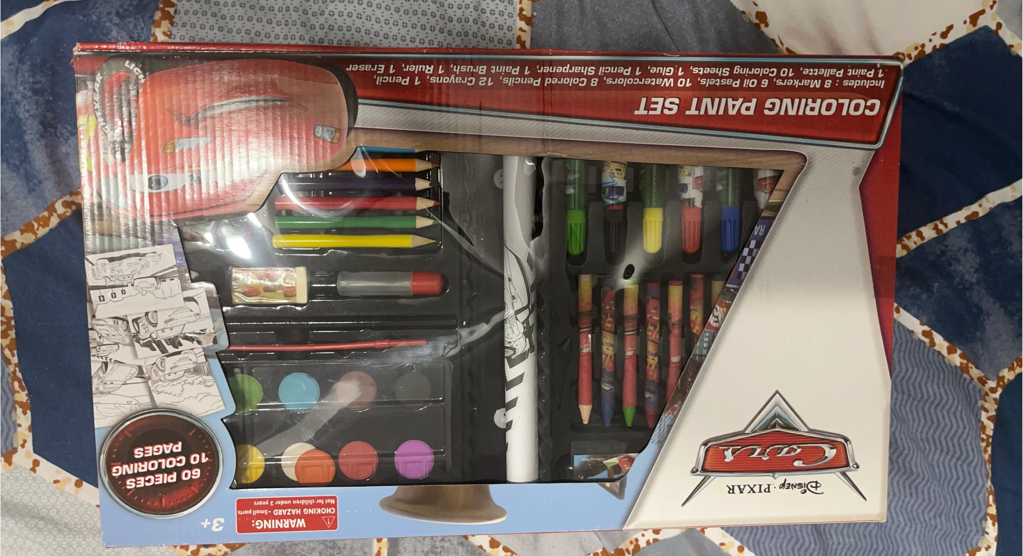 This Disney Cars coloring paint set includes 8 markers, 6 oil pastels, 10 watercolors, 8 colored pencils, 12 crayons, 1 pencil, 1 paint palette, 10 coloring sheets, 1 glue, 1 pencil sharpener, 1 paint brush, 1 ruler, and 1 eraser. It contains 60 pieces and 60 coloring pages. Recommended for ages 3+.