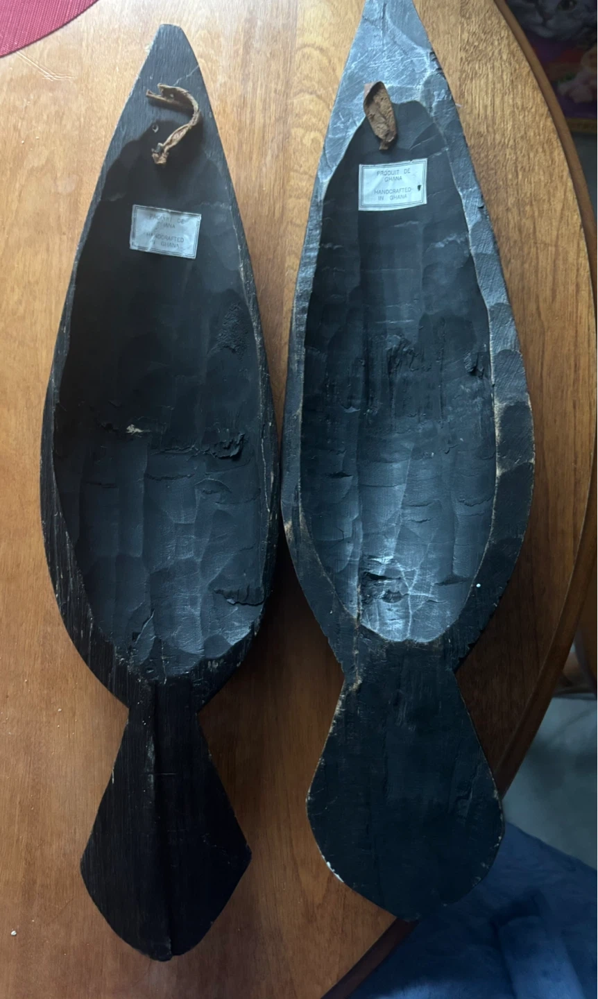 Two decorative wooden masks featuring intricate metallic detailing. These handcrafted pieces are perfect for adding a unique touch to your home decor. Handmade in Ghana.