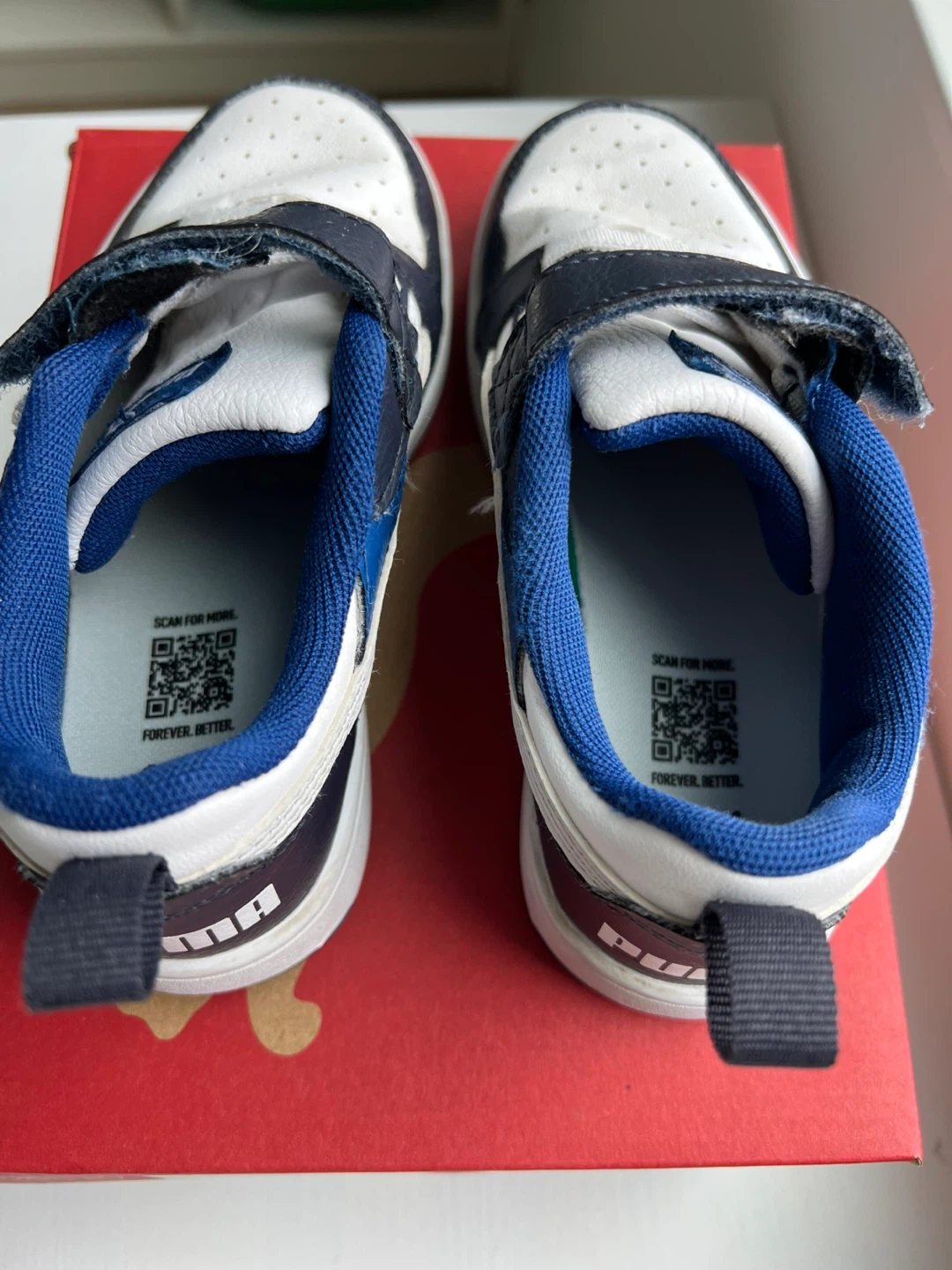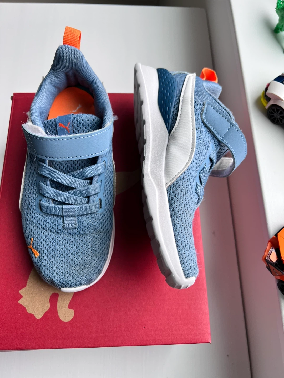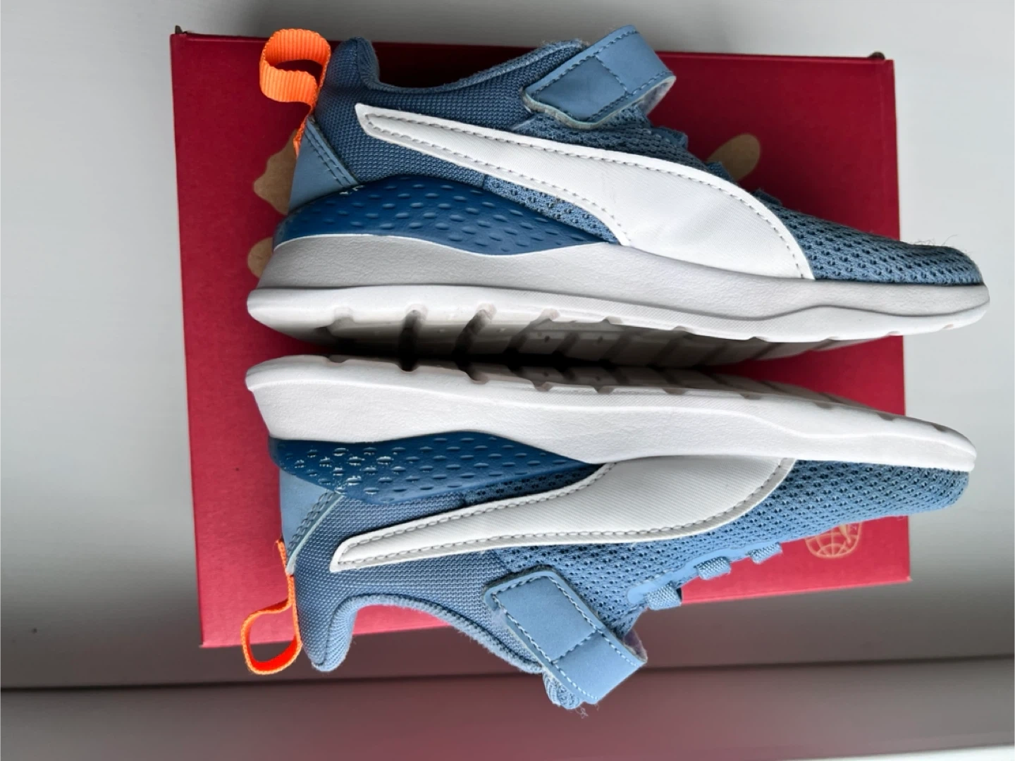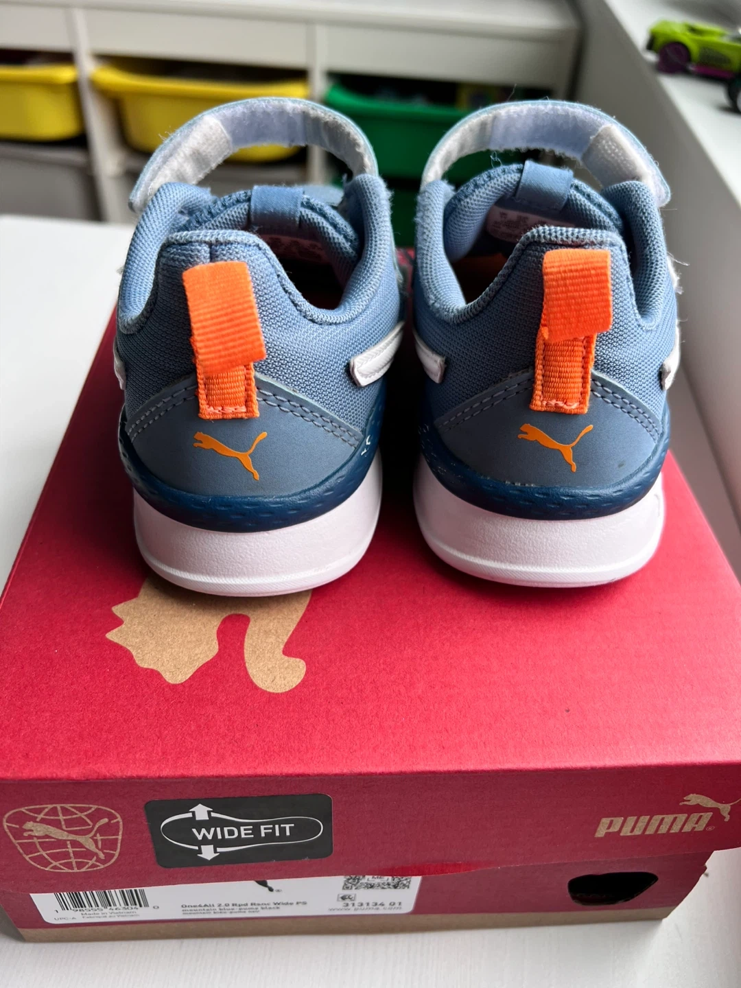These 2 Puma boy's sneakers are blue and white with hook-and-loop closures. They have a wide fit and an orange pull tab. They are great for active little ones!