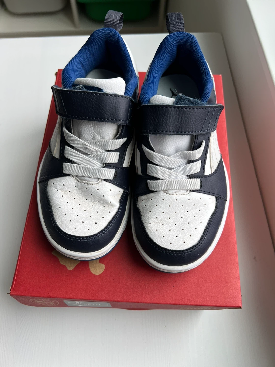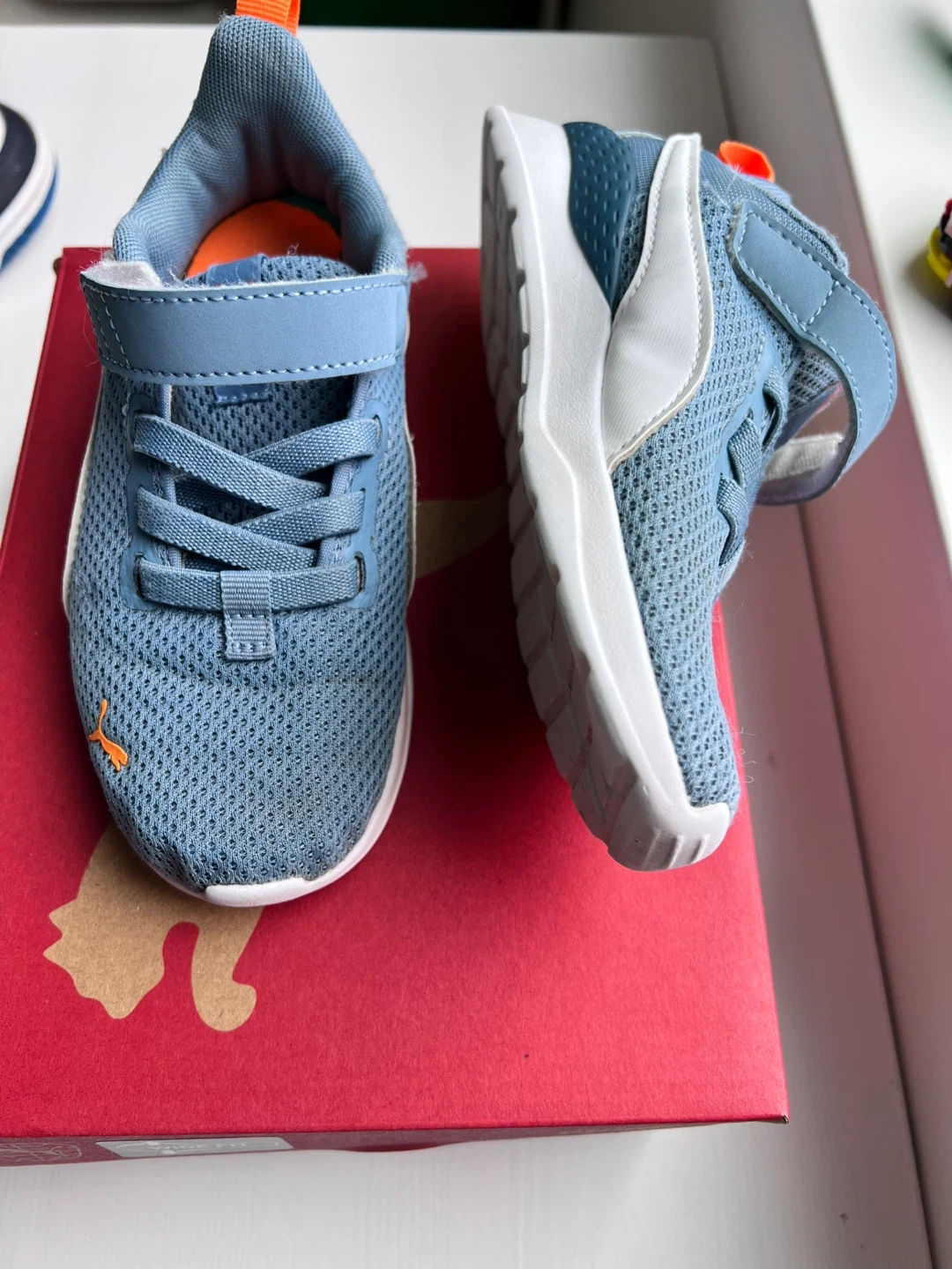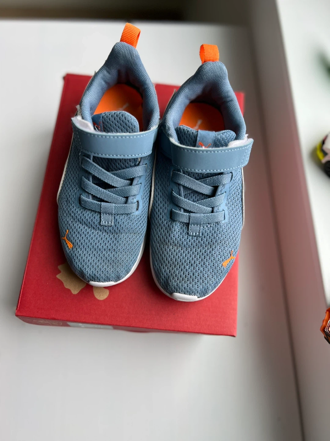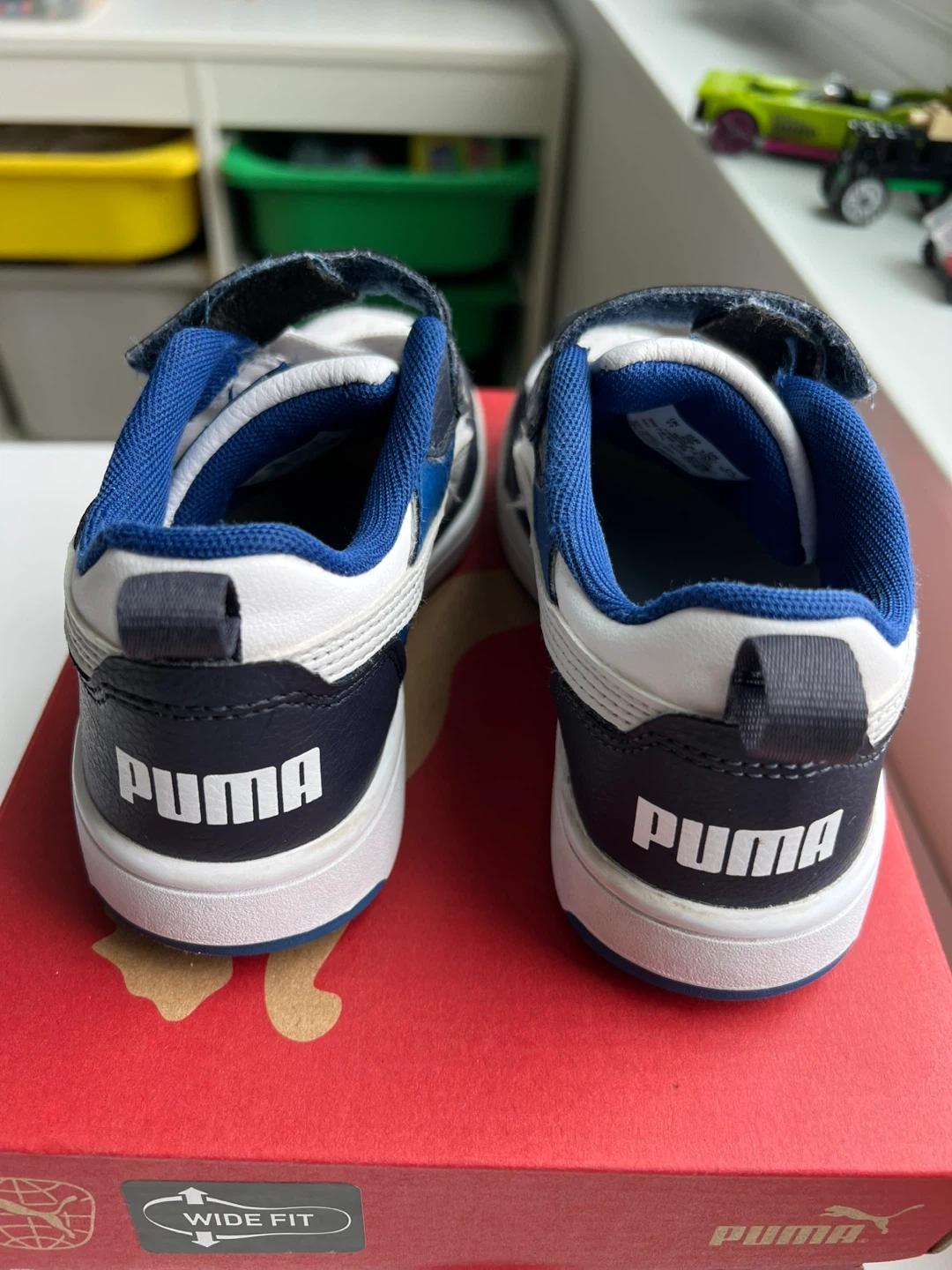 These 2 Puma boy's sneakers are blue and white with hook-and-loop closures. They have a wide fit and an orange pull tab. They are great for active little ones!