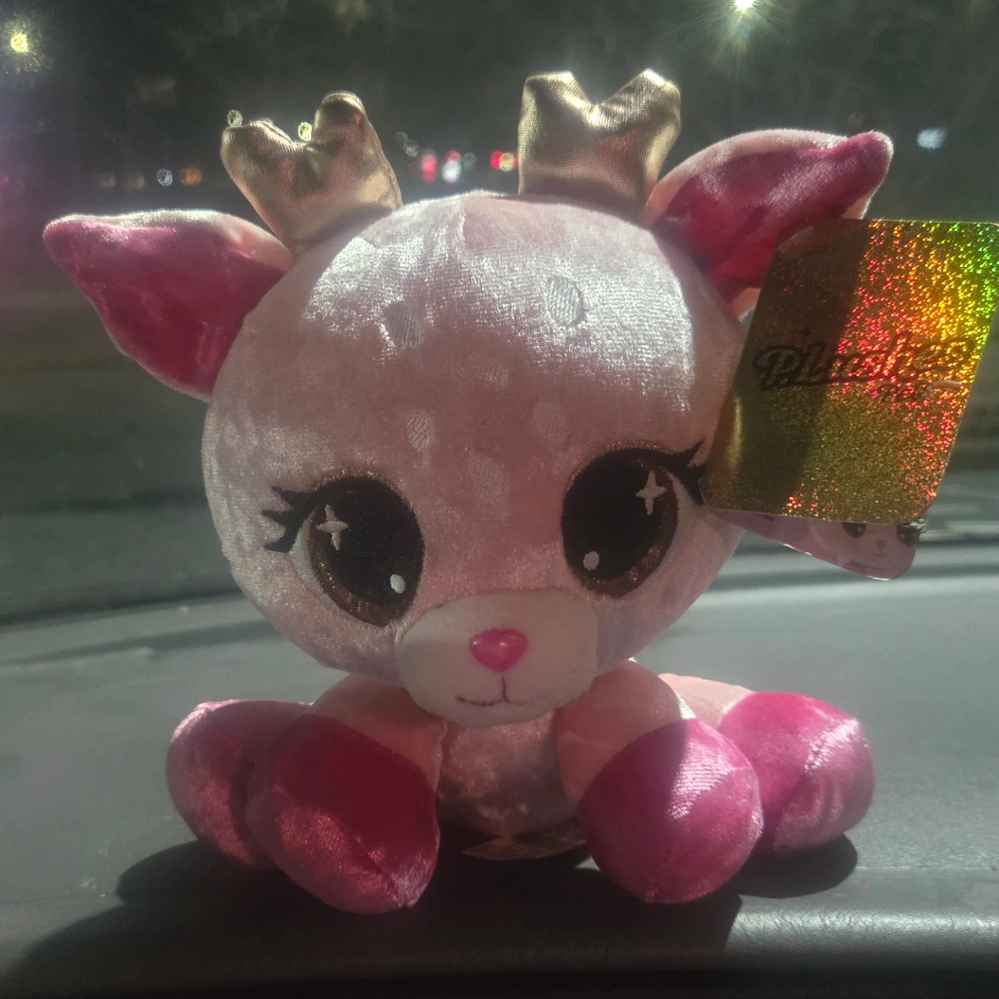 This stylish Lissa plush is from Gund. It's 6 x 6 inches and weighs 4 ounces. It's made with super soft blush pink crushed velvet fur and has delicate spots on her face. Her perky ears match her fuchsia hooves. This plush has a glittering golden collar and sparkling gold eyes with citrine glitter eyeshadow. Her antlers are shiny gold.