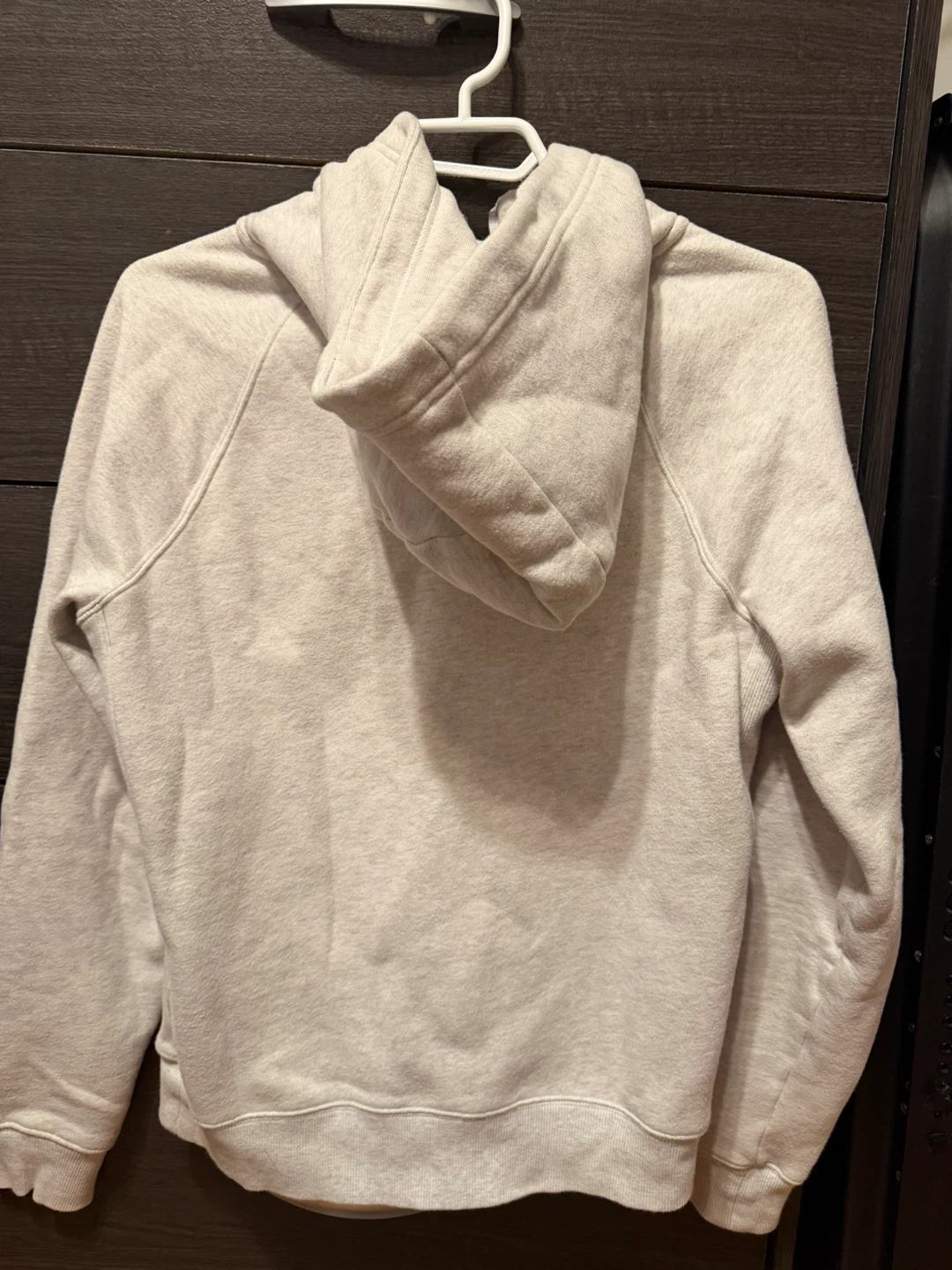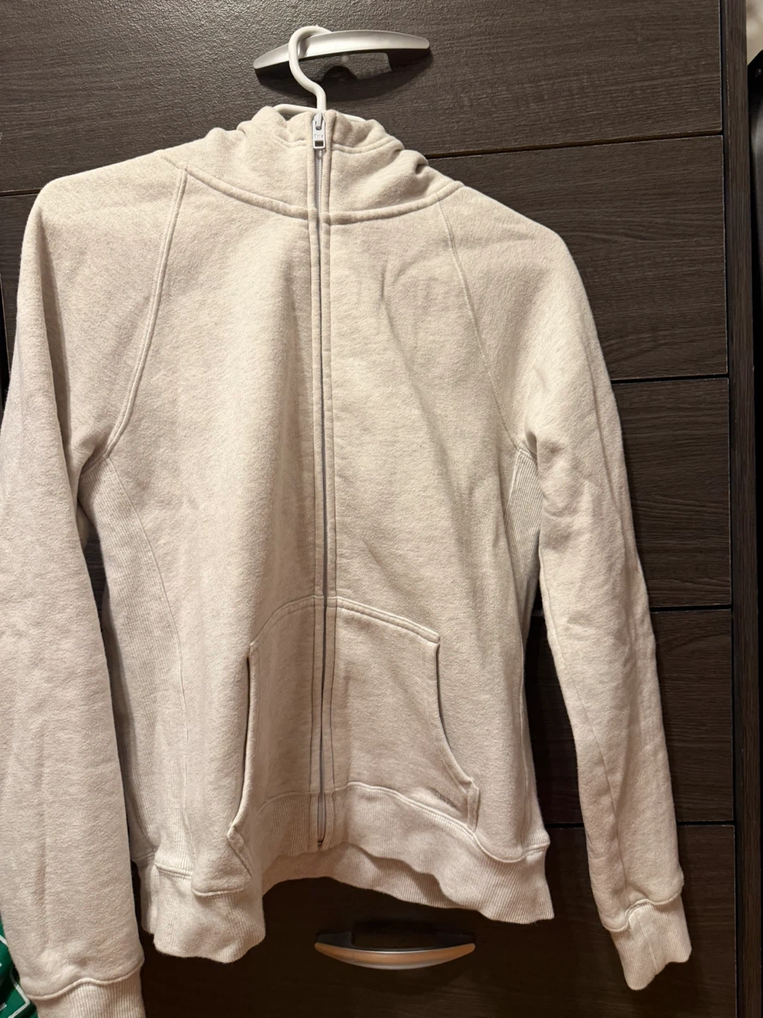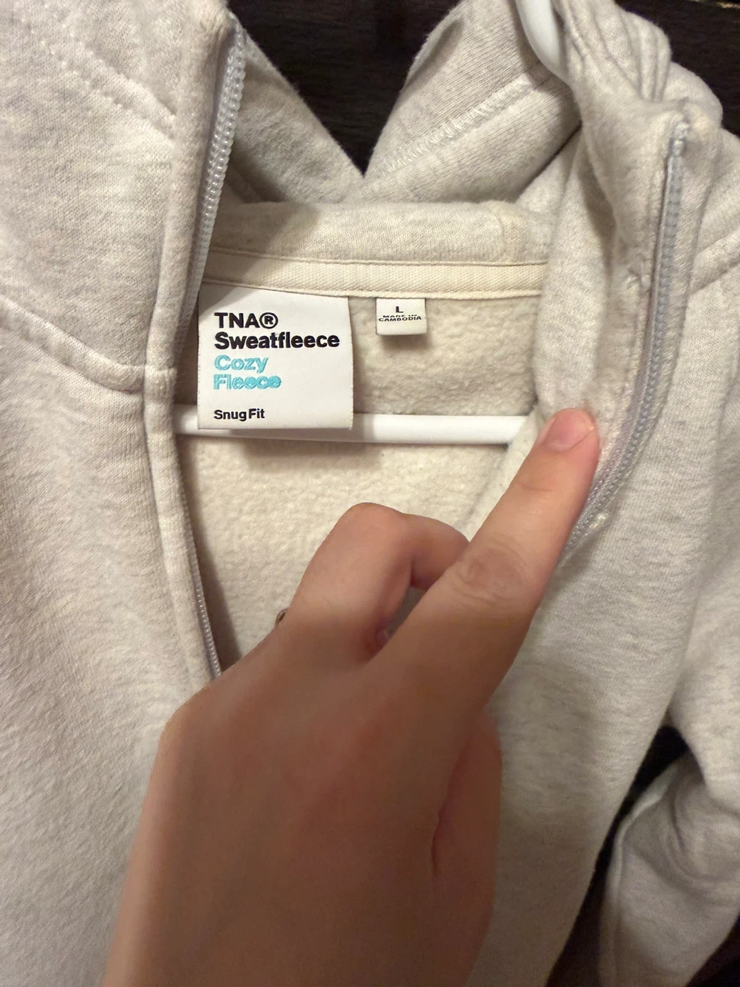 This is a TNA Cozy Fleece zip-up hoodie. It's made with a comfortable sweatfleece material. The size is Large and it comes in a snug fit.