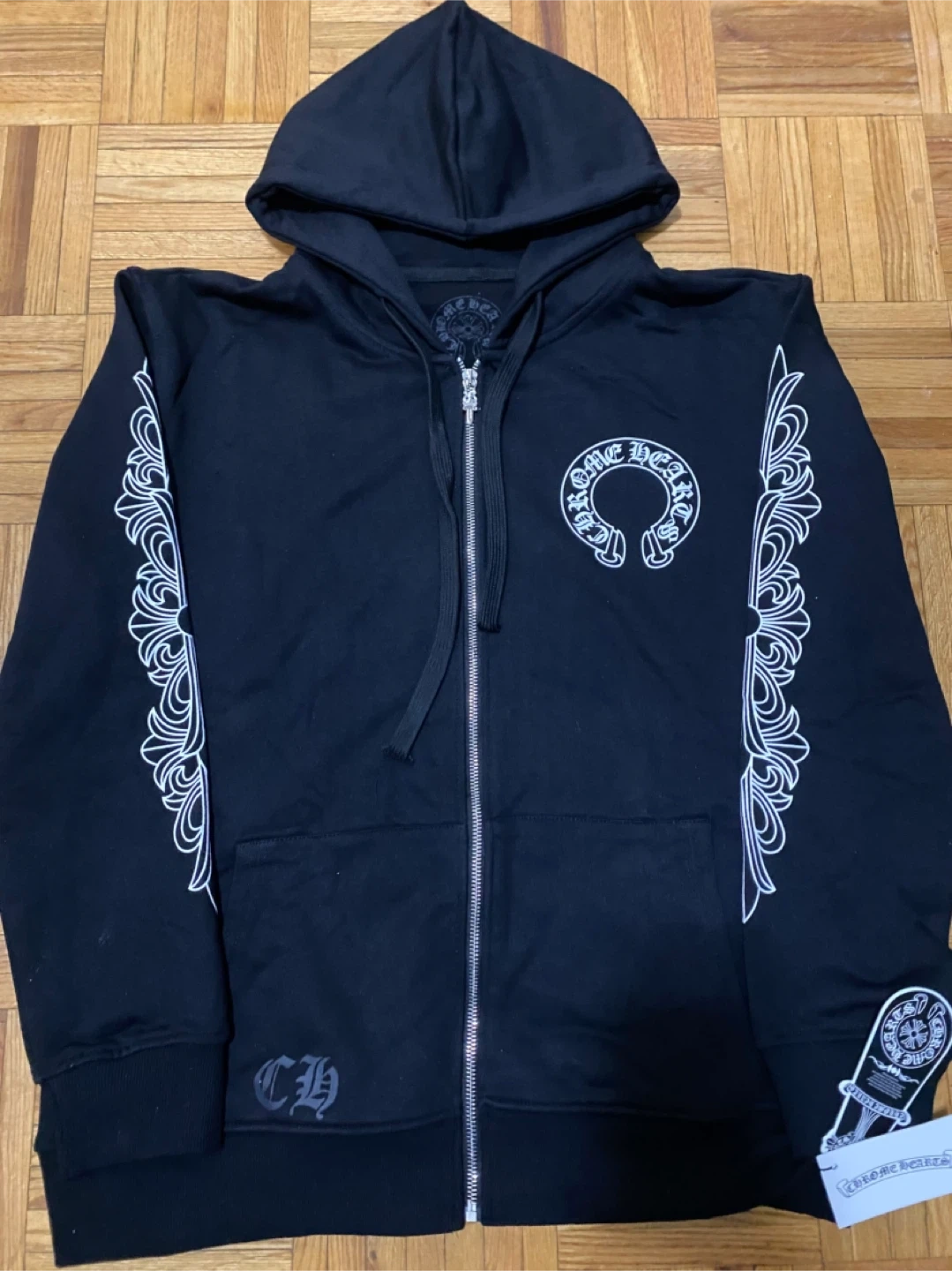 This is a black Chrome Hearts zip-up hoodie featuring the iconic horseshoe logo on the back and sleeve detailing. It's made from a comfortable fabric and comes in size S. The hoodie is still in its original packaging, ready to wear!