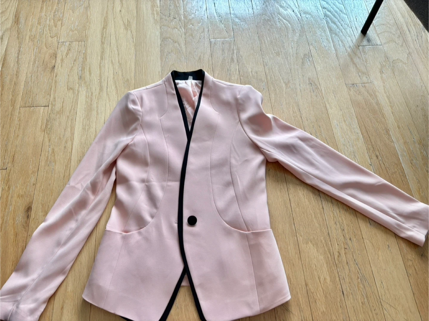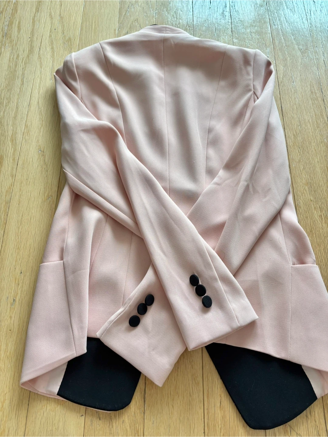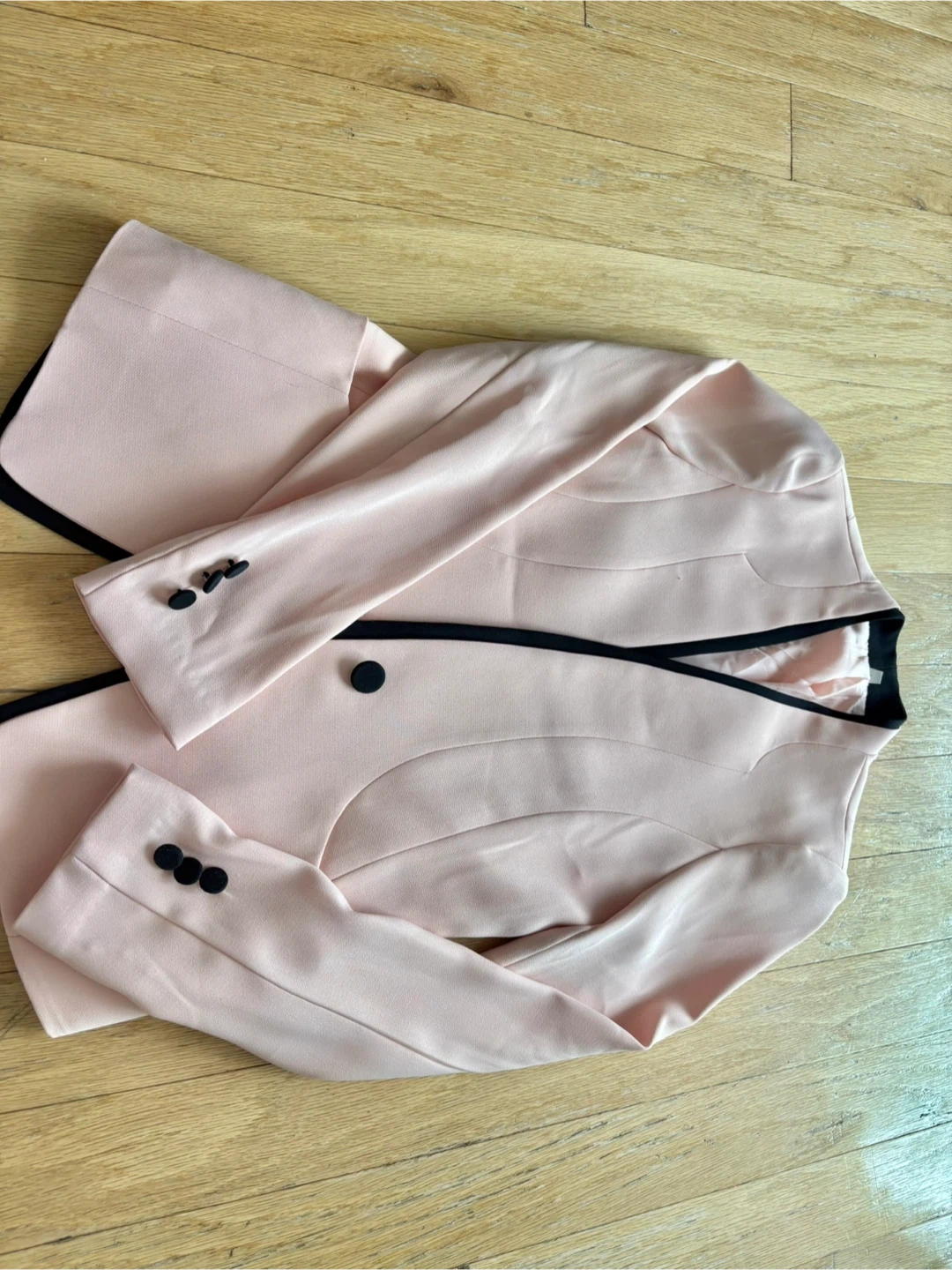 A stylish pink blazer featuring a sharp black trim and matching buttons. This jacket has a flattering cut and long sleeves with button details. It's perfect for dressing up an outfit!