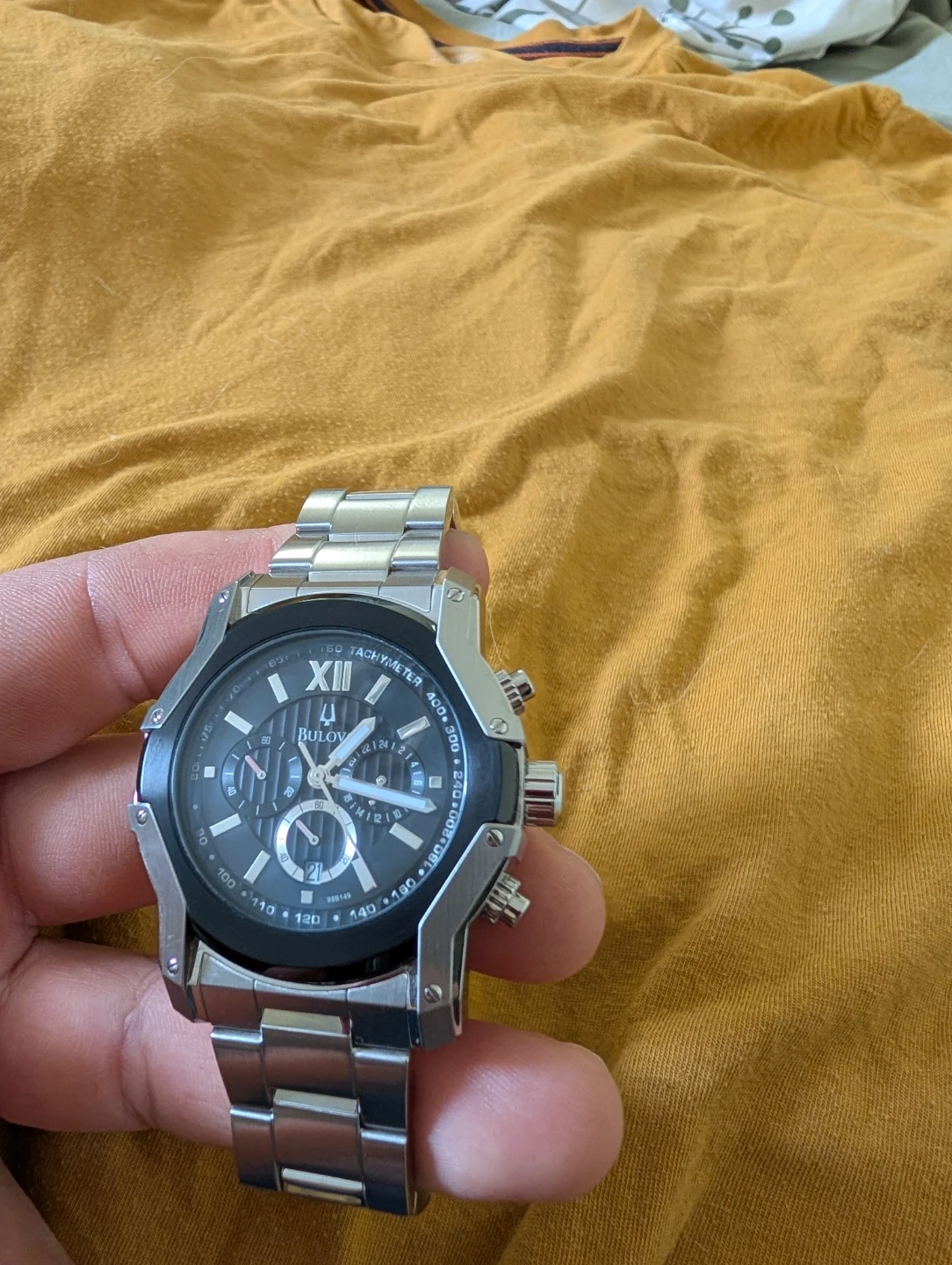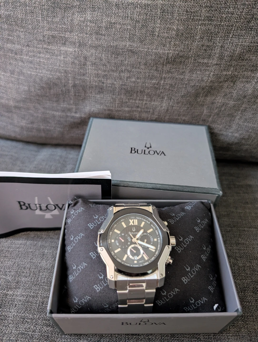 Selling a Bulova men's watch in great condition! It comes with the original box and pillow. The watch is stainless steel with a black face and silver band. It's a stylish and functional timepiece that would make a great addition to any collection