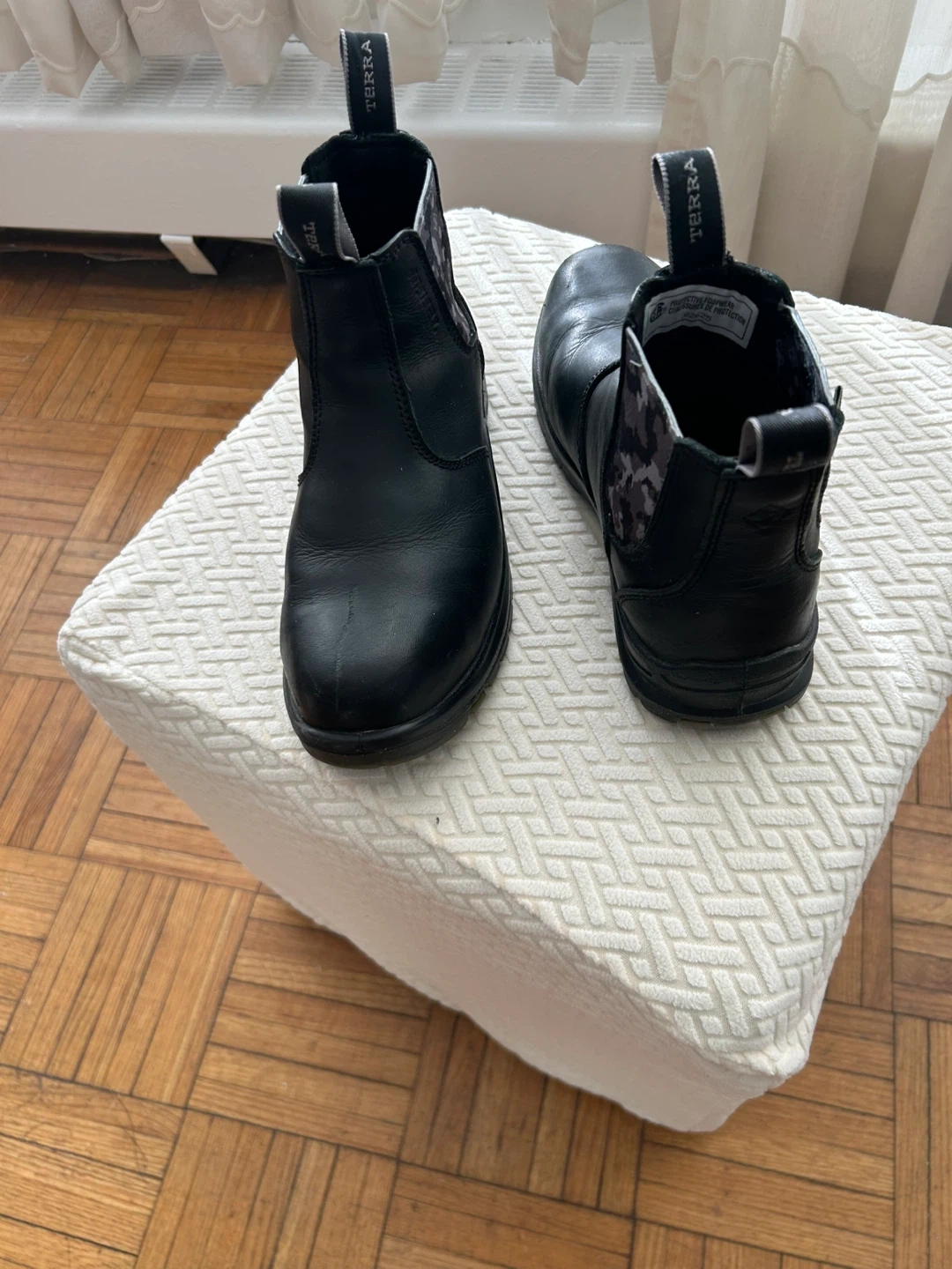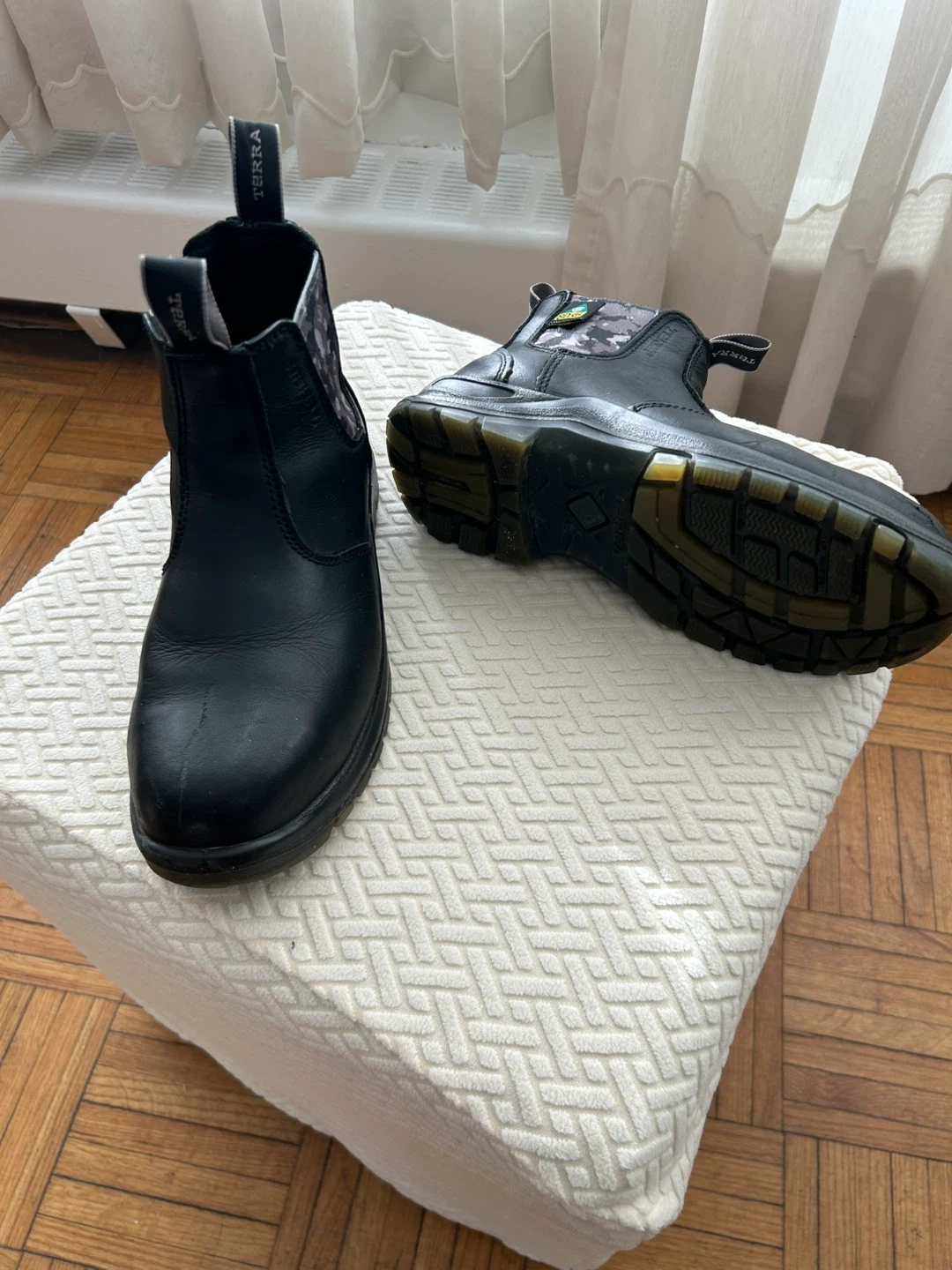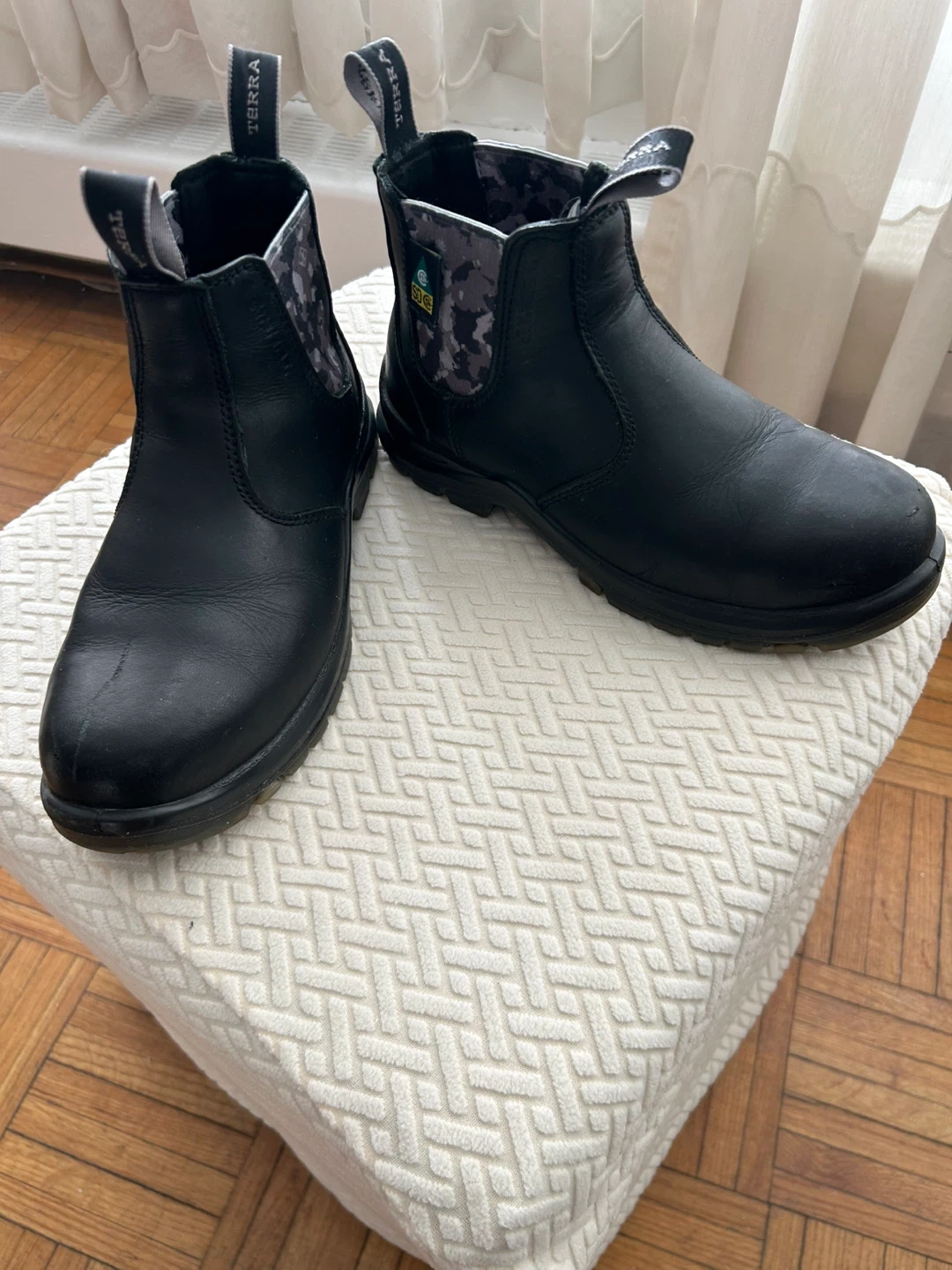 Terra Murphy 6" slip-on work boots in black. Leather uppers with elastic side panels for easy on/off. Durable rubber sole.