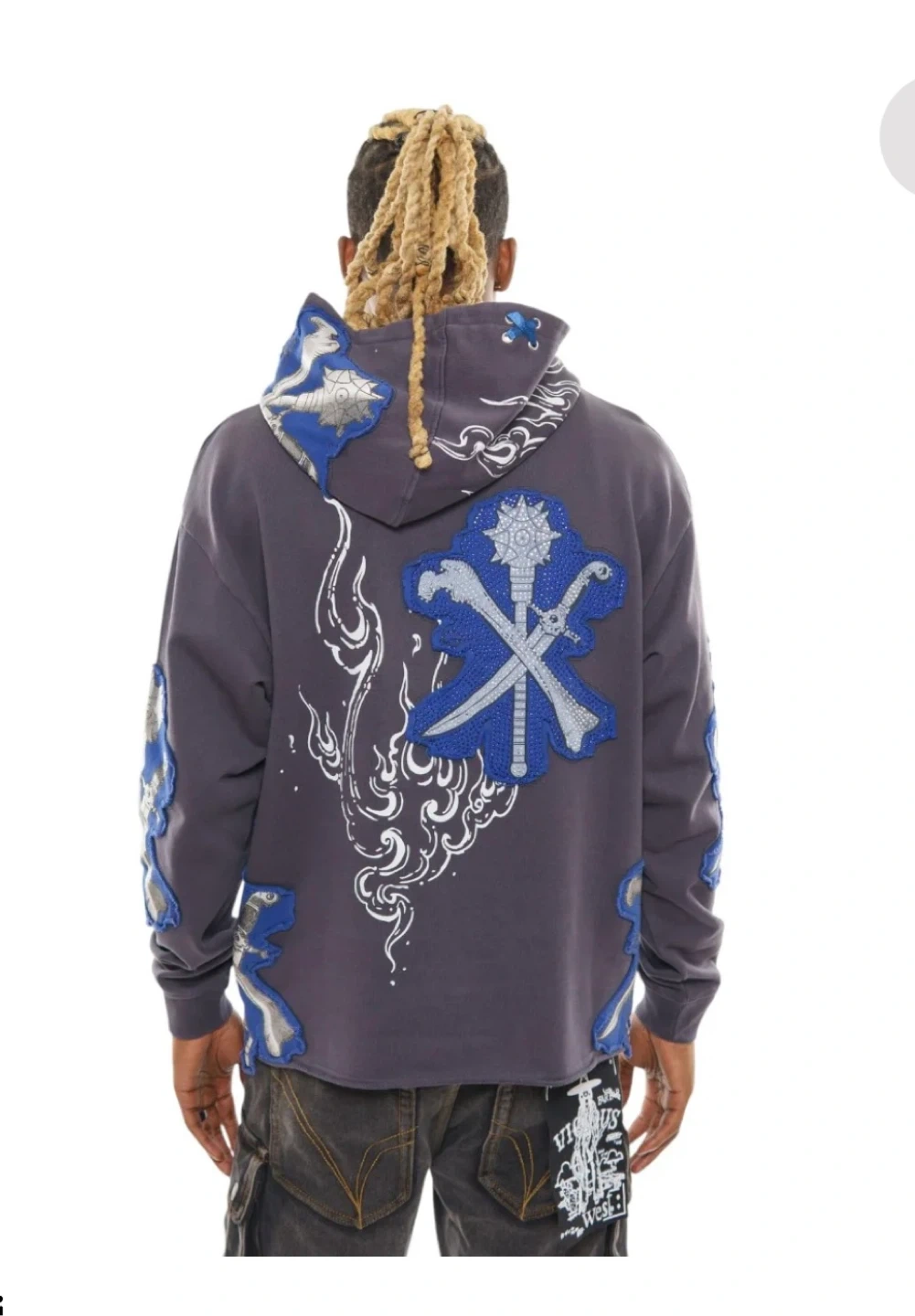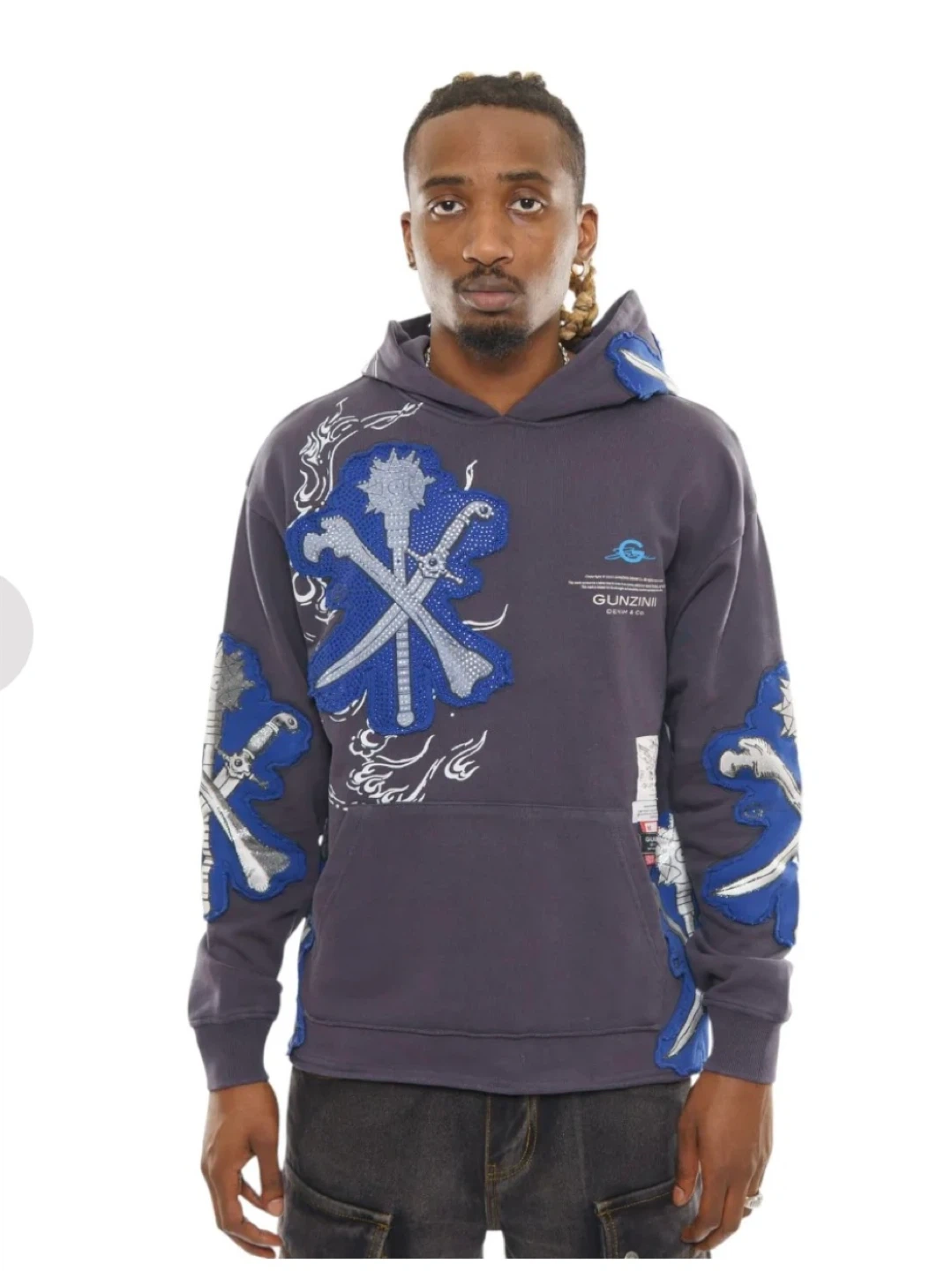 Grey crewneck hoodie with blue and silver graphic appliques on the front, back, and sleeves. It's made of a comfortable material. This hoodie is perfect for casual wear. new with tags