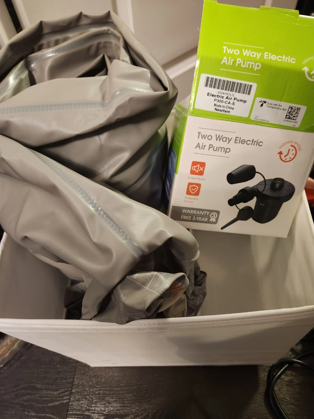 This is a Newitem brand Two Way Electric Air Pump, model P300-CA-S. It's designed for lower noise and higher speed inflation. This pump includes a 3-year warranty. It's useful for quickly inflating air mattresses or other inflatables.