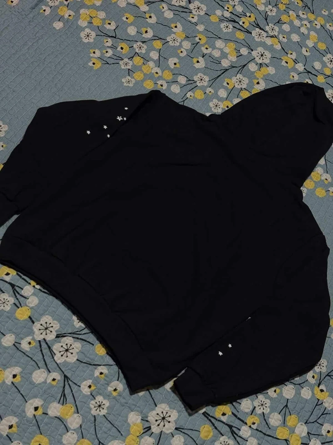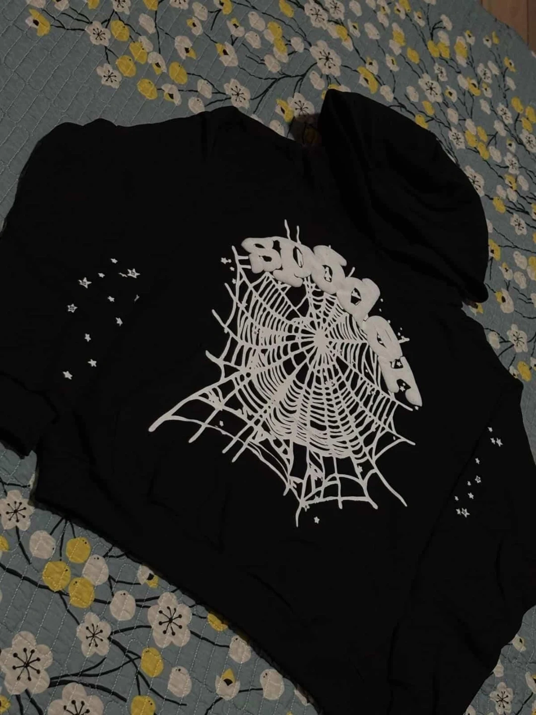 Black hooded sweatshirt featuring a large white spiderweb graphic on the front. It also has small star accents on the sleeves. Made of comfortable fabric.