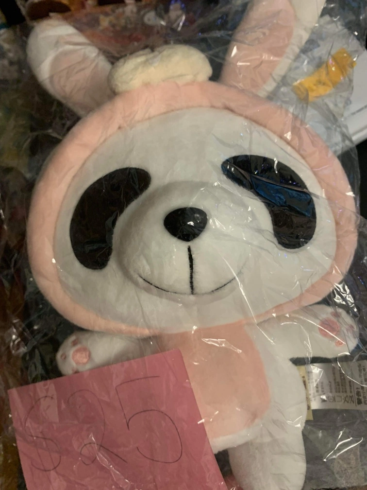 Cute panda plush wearing a bunny costume. Perfect for collectors or anyone who loves cute plushies! The hood part of the bunny costume can be taken off/put down.