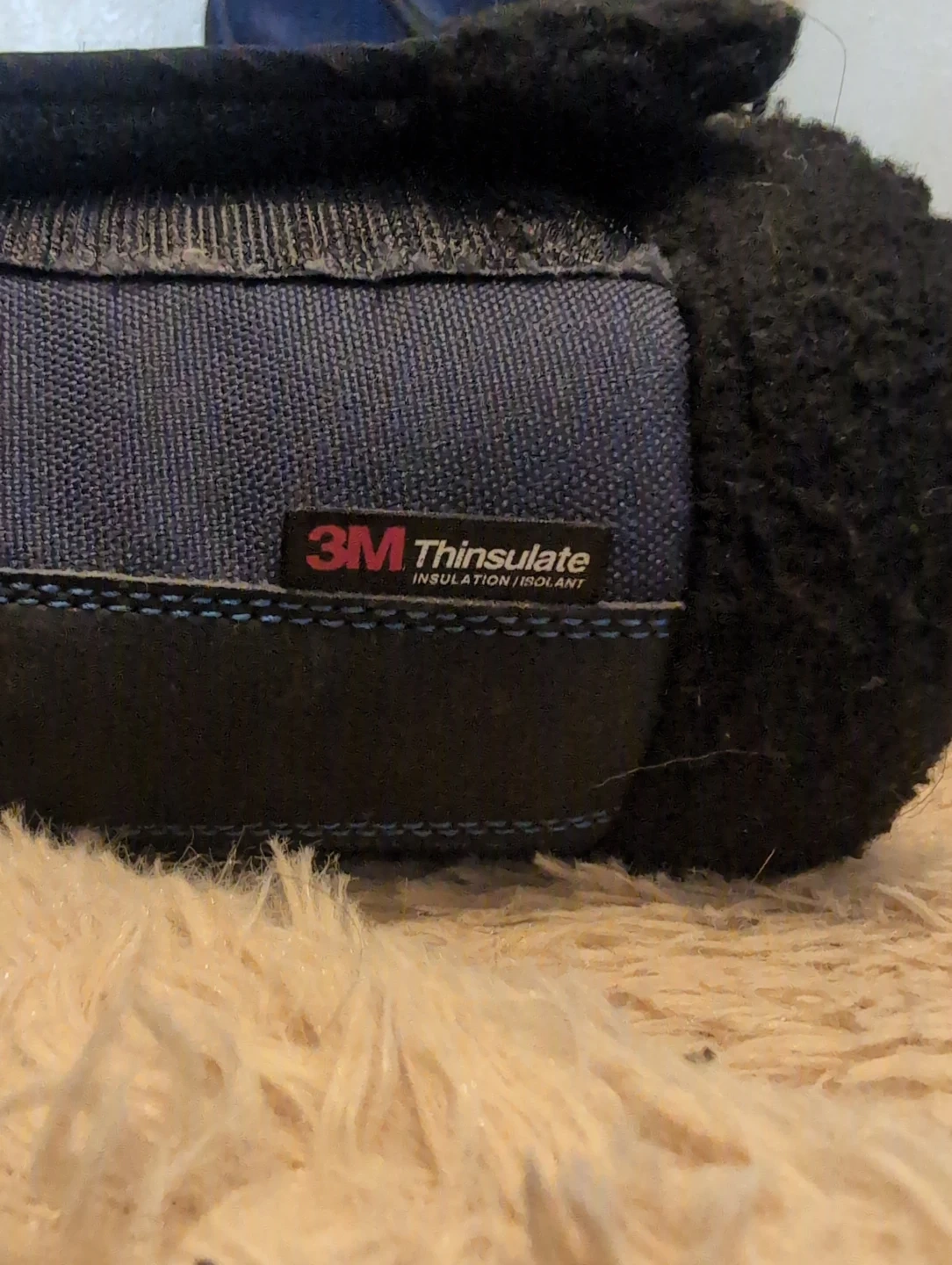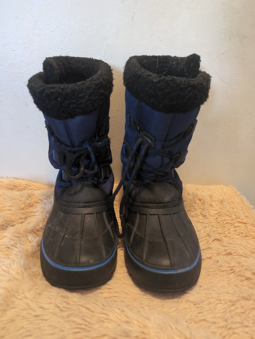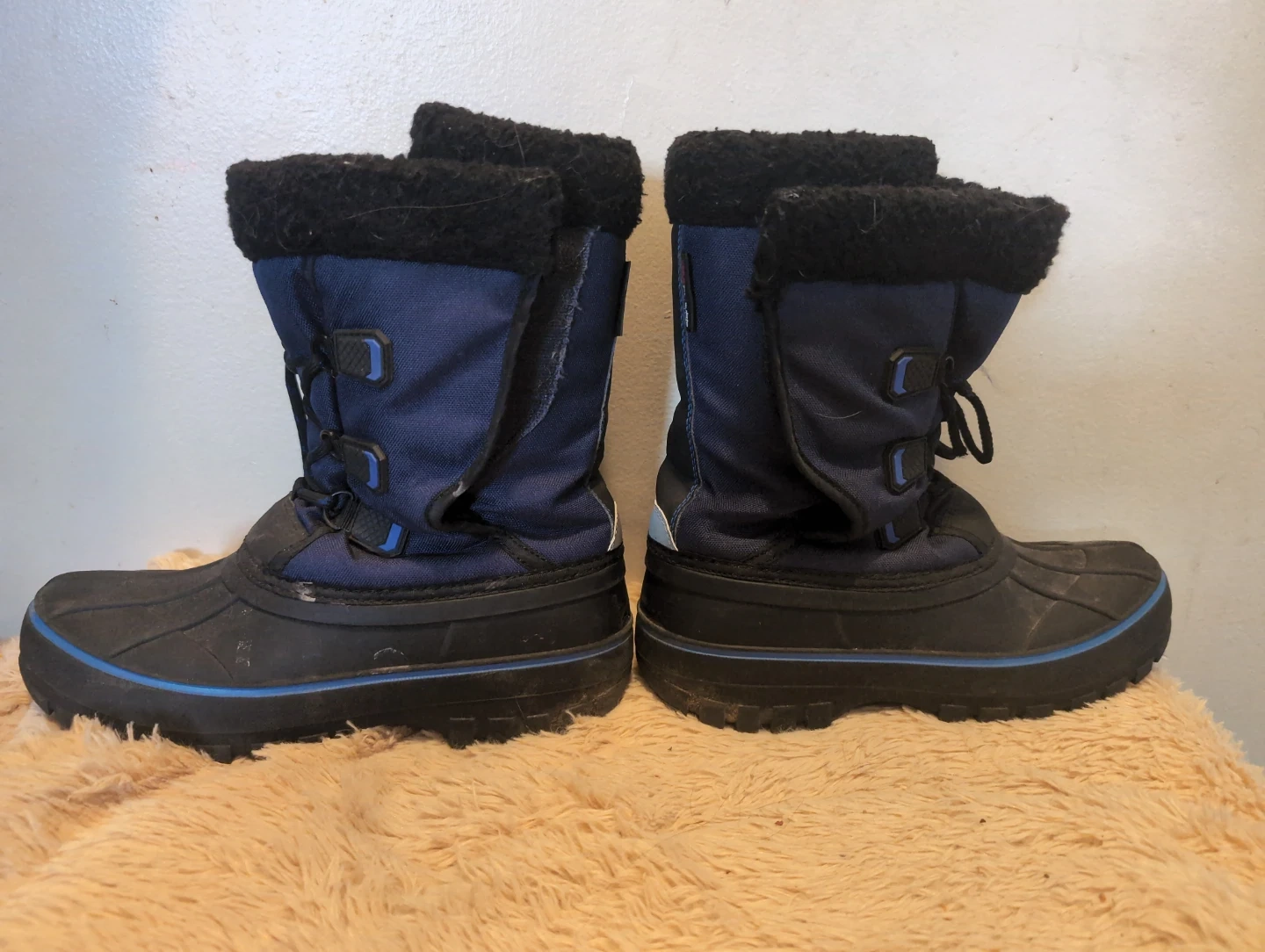 Blue and black winter boots with faux fur lining. They feature 3M Thinsulate insulation for warmth. The boots have lace-up closures. Size is 4. Still have life left in them for a spare pair or next winter.
