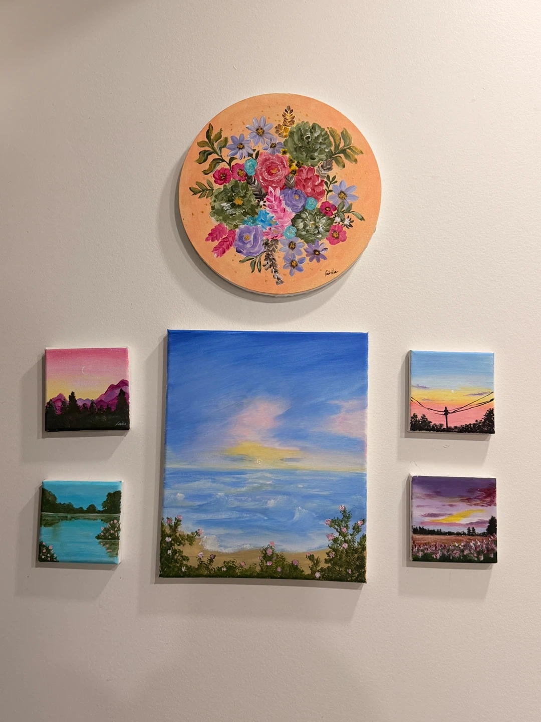 Hand-painted acrylic art set featuring a circular floral bouquet and four landscape scenes. Pieces include a beach sunset, a serene lake, a mountain sunset, and a field of flowers. Perfect for adding a touch of color and art to any room!