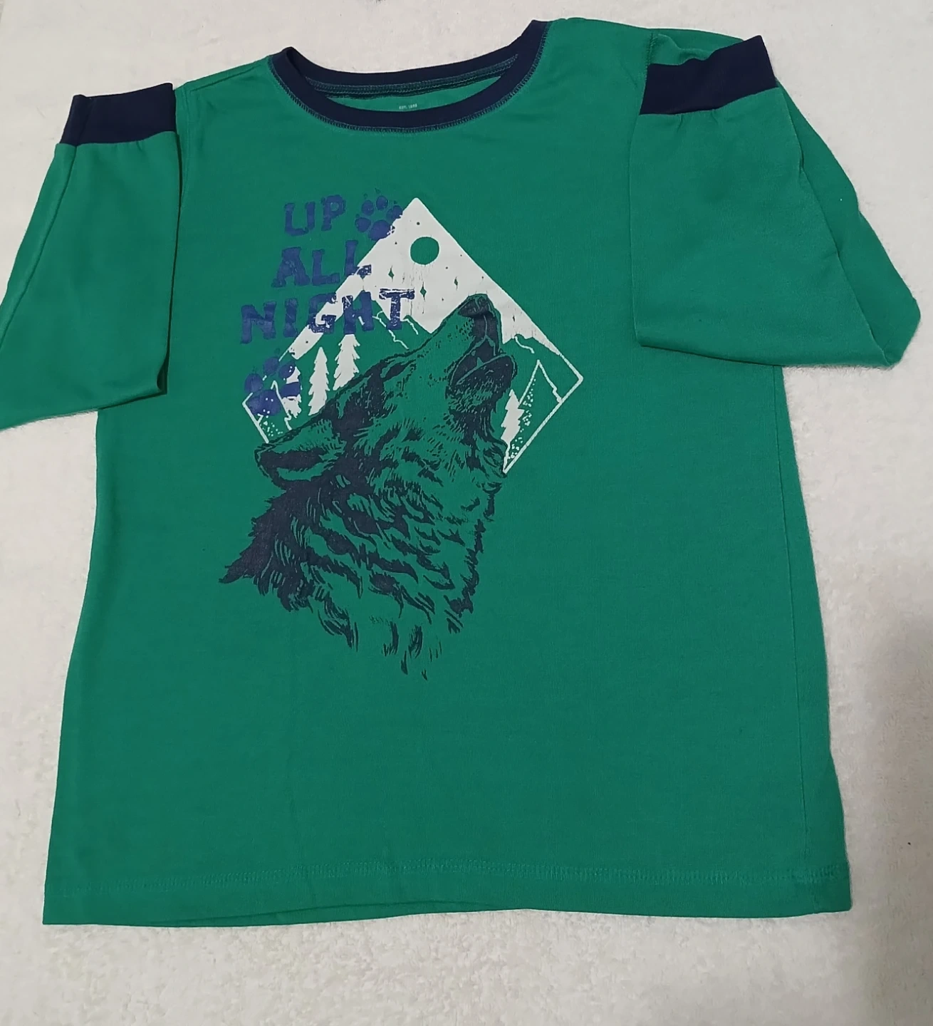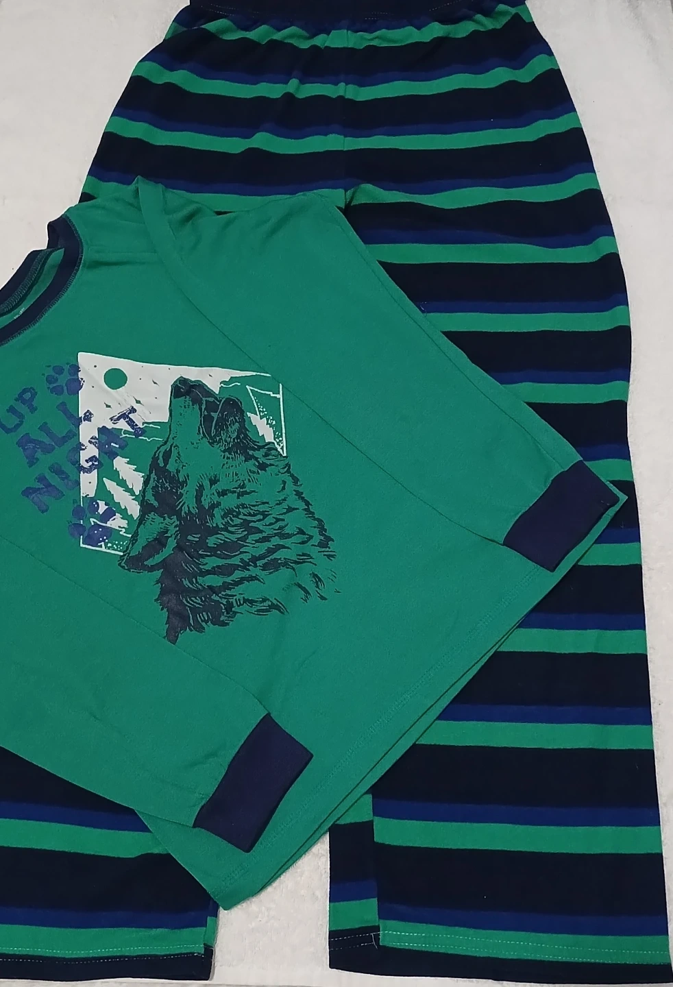 Boys' pajama set with a green long-sleeved shirt featuring a wolf design and striped pants. Perfect for a cozy night's sleep!