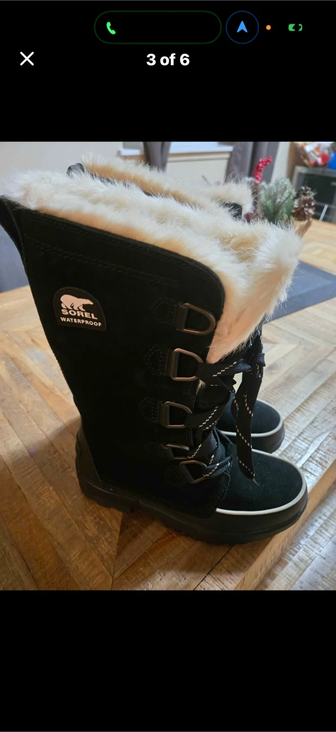 These Sorel winter boots are black and waterproof. They feature a warm, fuzzy lining for extra comfort. Built to keep your feet warm and dry in snowy conditions!