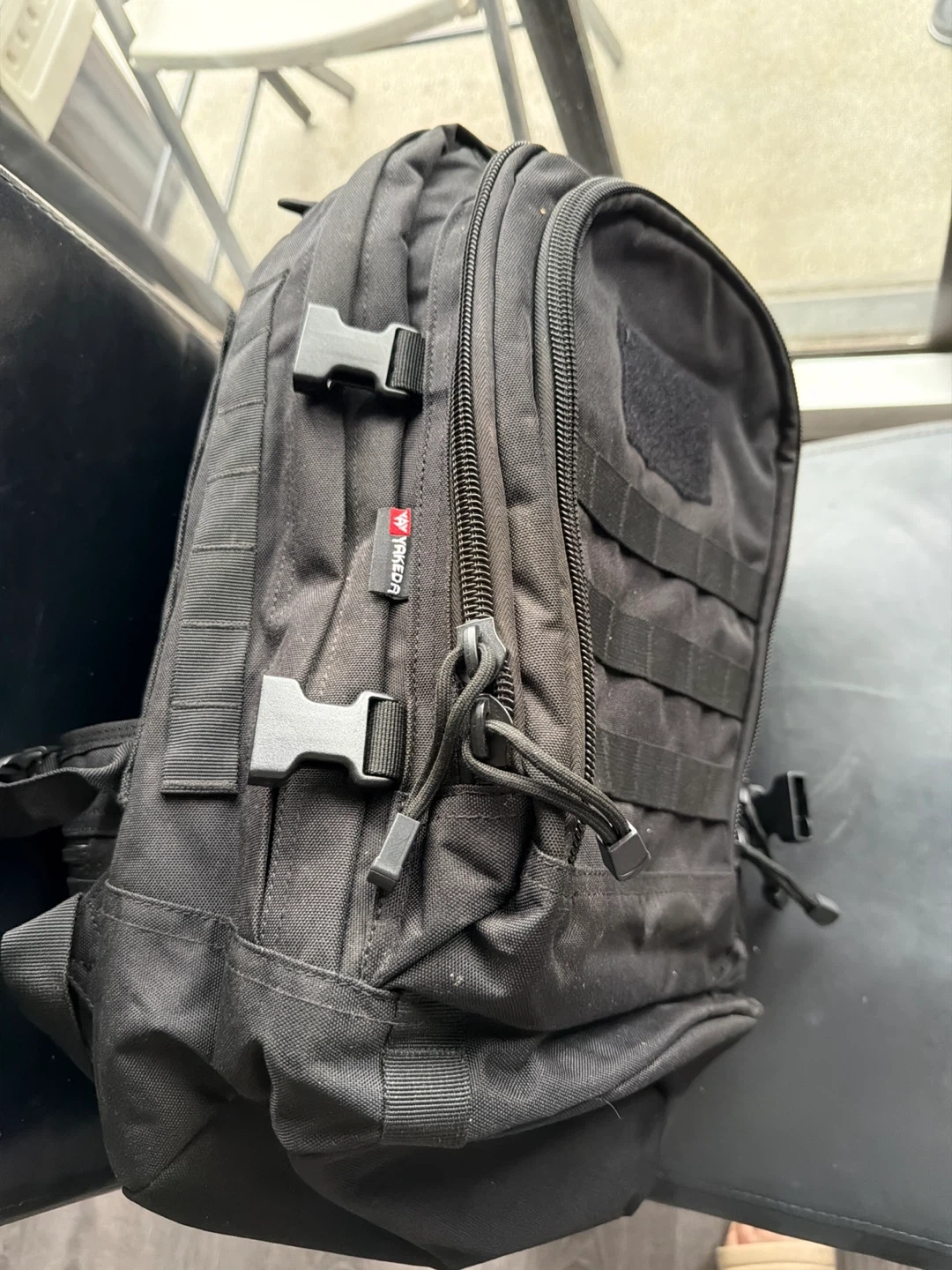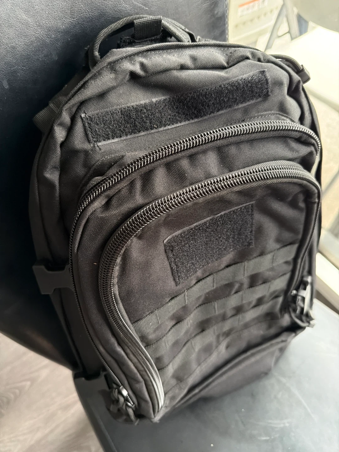 Black tactical backpack with multiple compartments and MOLLE webbing. Durable fabric construction. It's great for outdoor activities or everyday use!
