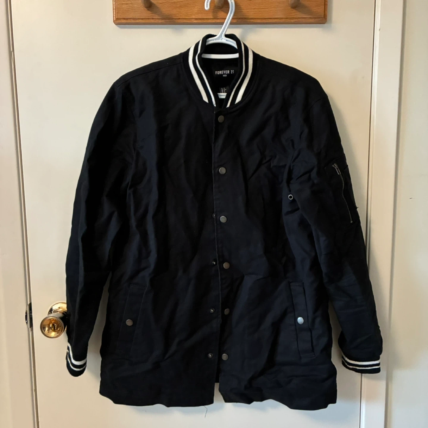 Black Forever 21 varsity jacket with white striped trim. It has a zip pocket on the sleeve. Ribbed collar and cuffs. Size small