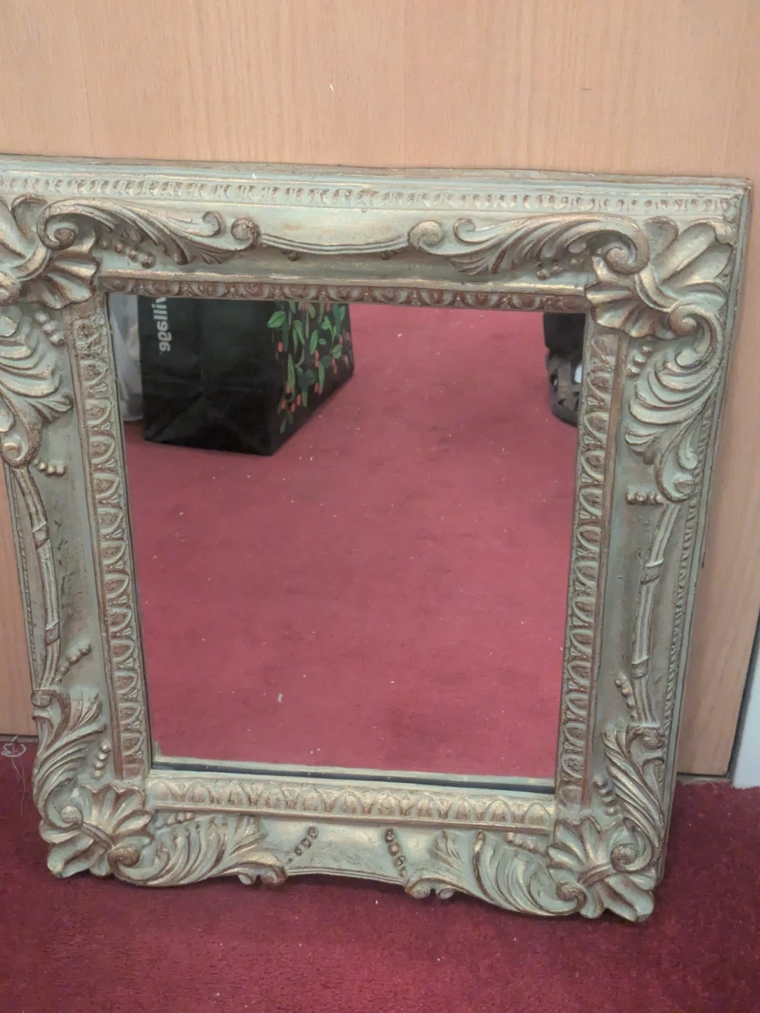 Decorative wall mirror with an ornate, carved frame. It has a distressed antique gold and pale green finish. Adds a touch of vintage charm to any room!