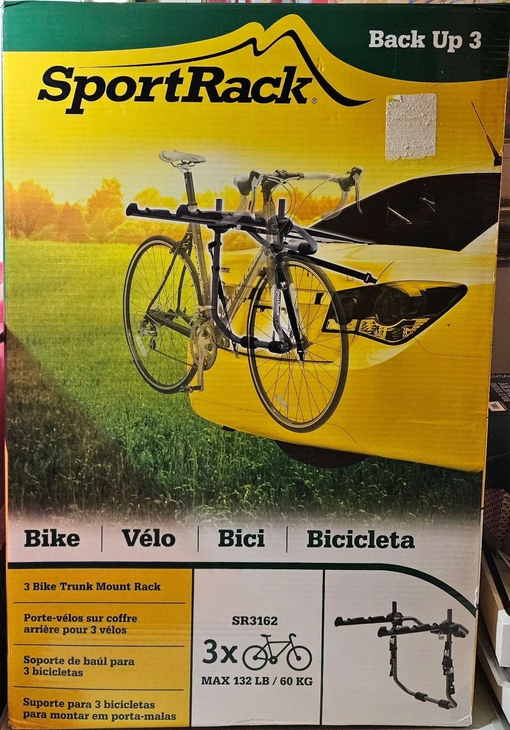 Selling a SportRack Back Up 3 Bike Trunk Mount Rack, model SR3162. It can accommodate up to 3 bikes and has a maximum weight capacity of 132 lbs (60 kg). The rack features padding to protect the trunk and six adjustable straps to hold the rack securely to the vehicle. It also folds flat for convenient storage!